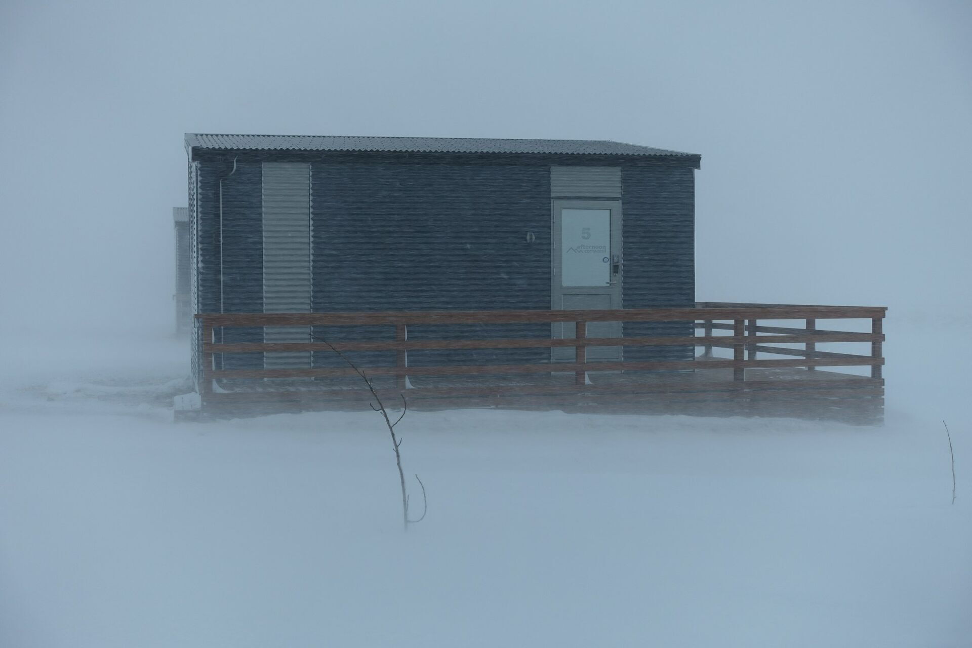 Island – Das Afternoon Cottage während eines Schneesturms.