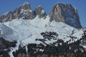 Genussabfahrt zwischen dem Sellamassiv und dem Platt- und Langkofel bei genügend Schnee.
