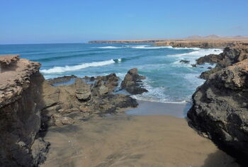 Nach einem kurzen Abstieg durch ein Barranco erreicht man den Strand, der zum Baden einlädt.