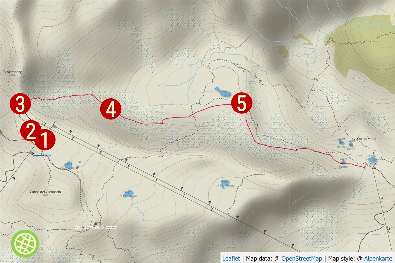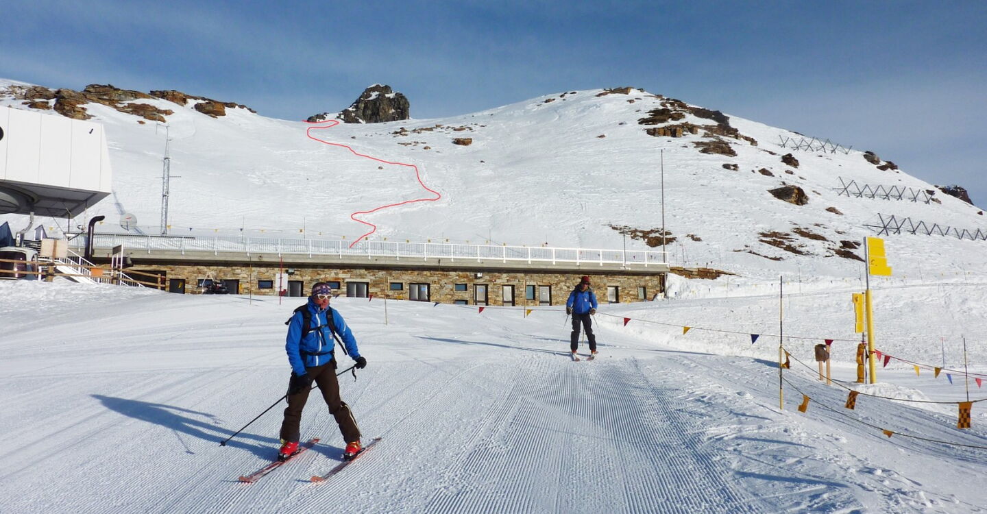 Nach einem kurzen Aufstieg und einer Abfahrt mit dem Ziel vor Augen kommt man wieder ins Skigebiet zurück. Die Abfahrt führt über einen Osthang. Folgende Ausrüstung wird empfohlen: Produkte für alpine Sicherheit im Schnee, Freerideski und Skitourenhelm. Es gibt keine Einkehr auf der Tour. Außer man nimmt vor oder nach der Tour eine Stärkung in dem Rifugio Città di Vigevano. Beste Jahreszeit: Januar bis April. Uns erwarten kurze Stücke mit bis zu 30° Hangneigung.