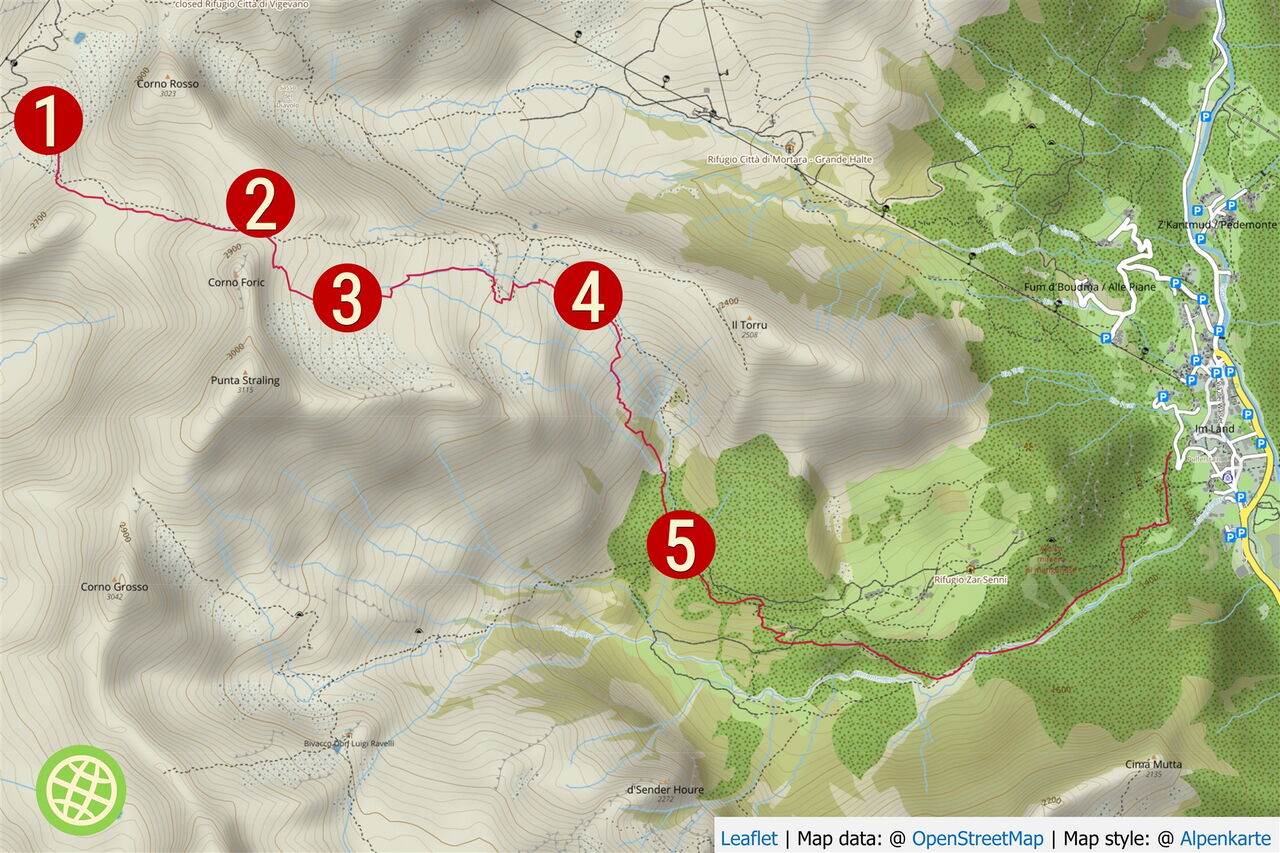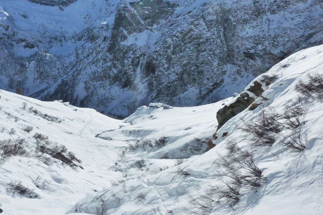 Der Startpunkt ist bei der Bergstation der Seilbahn Nr. 30 Pianalunga Cimalegna Salati, von wo wir Richtung Gabit bis etwa zur Hälfte abfahren, um dann links in den Hang zu queren.