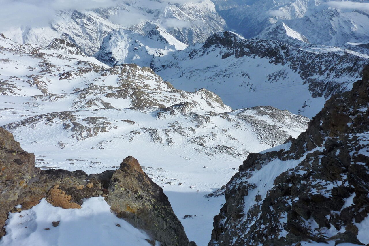 Der Startpunkt der Tour ist bei der Bergstation der Seilbahn Nr. 26 Passo dei Salati Indren. Von hier geht es rechts zum Punta Indren, wo man sich schon einmal den Einstieg anschauen kann.