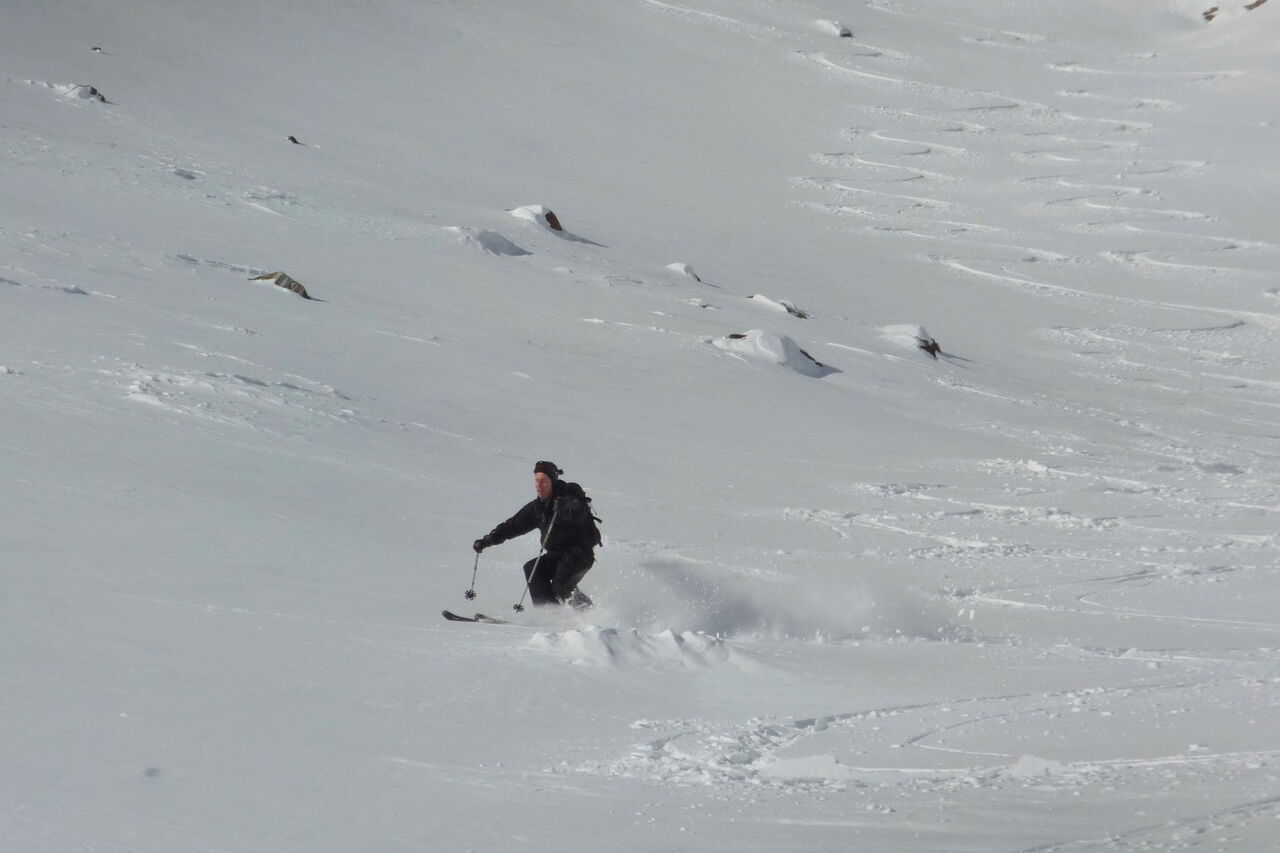 Vor uns liegen breite und traumhafte Tiefschneehänge. Dabei entfernen wir uns nicht zu weit von den Ausläufern des La-Malfatta-Massivs auf der rechten Seite, um die Brücke nicht zu verpassen.