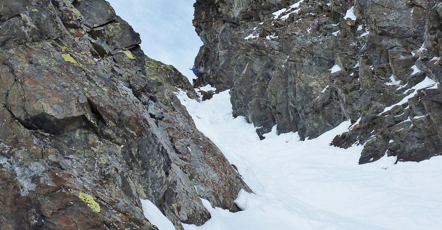 Eine lange Querung führt zur Abseilstelle, die nicht einfach zu finden ist. Einfache Orientierung während der Abfahrt. Die Abfahrt führt über einen Südosthang. Folgende Ausrüstung wird empfohlen: Produkte für alpine Sicherheit im Schnee, Klettergurt mit Kletterseil bis 50 m, Freerideski und Skitourenhelm. Es gibt keine Einkehr auf der Tour. Außer man nimmt vor oder nach der Tour eine Stärkung in dem Rifugio Città di Vigevano. Beste Jahreszeit: Januar bis Mitte März. Uns erwarten kurze Stücke mit bis zu 45° Hangneigung.