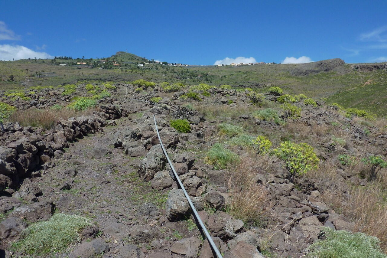 Nach 80 m folgen wir rechts der Ausschilderung Richtung (02) Ermita de San Isidro Labrador (803 m), bis wir auf einen Parkplatz treffen. Nach weiteren 500 m auf einem gepflasterten Weg haben wir den Mirador de Tagaragunche auf der Montaña del Calvario 806 m und die Ermita de San Isidro Labrador erreicht. An dieser Stelle wachte ein Posten, um nach Piraten Ausschau zu halten oder in Kriegszeiten vor Angreifern zu warnen. Bei guter Sicht ergeben sich atemberaubende Fernblicke: Im Osten angefangen sieht man den Teide auf Teneriffa, bei besonders guter Sicht Gran Canaria, San Sebastián, den Flughafen von La Gomera, die vorgelagerten Bergrücken auf La Palma und El Hierro. Nach dem Abstieg, wir befinden uns bereits auf der Asphaltstraße, biegen wir nach 80 m auf den links beginnenden Pfad ab. Auf dem Camino verlieren wir schnell an Höhe und befinden uns jetzt direkt unterhalb der Montaña del Calvario.