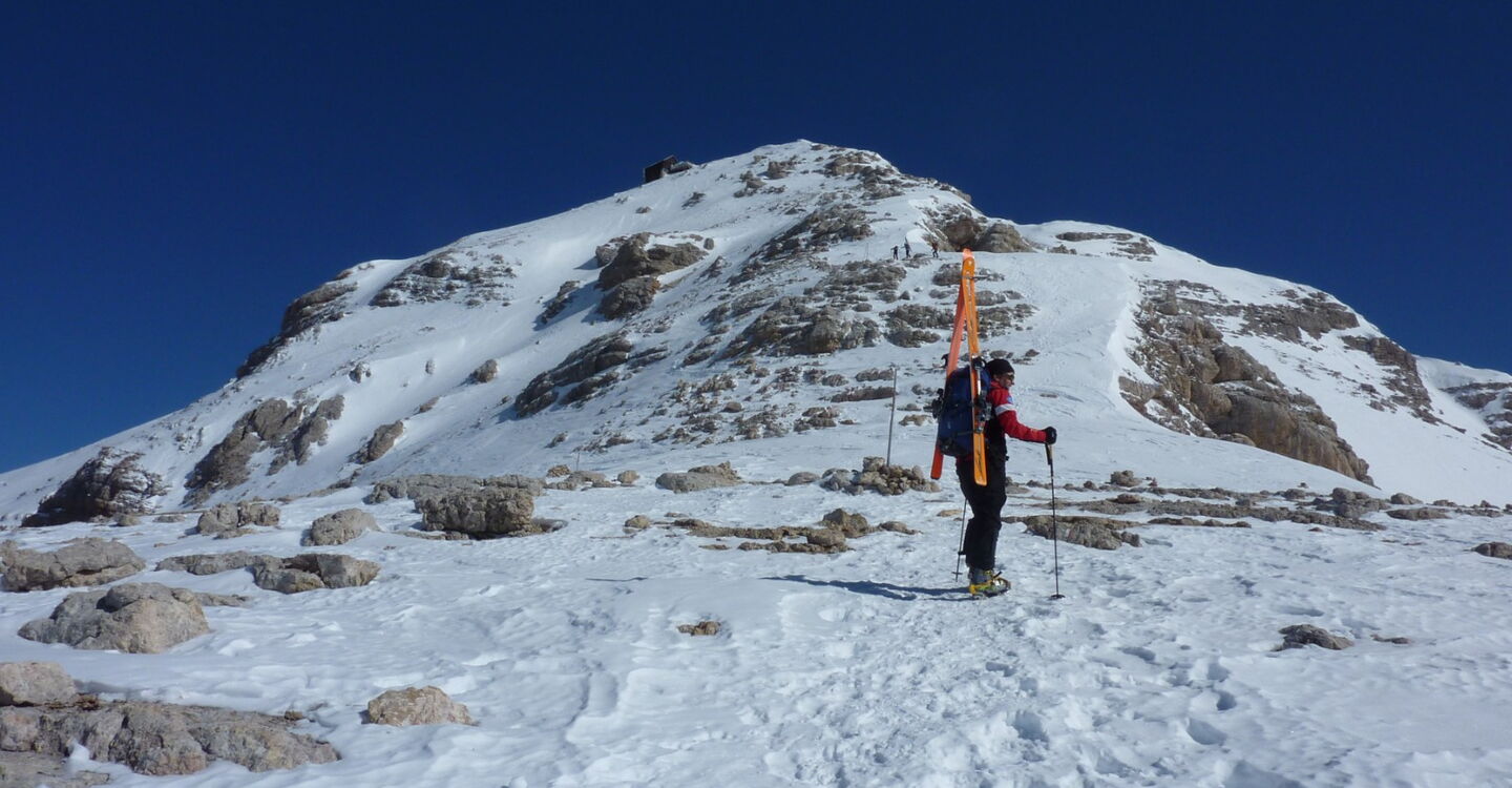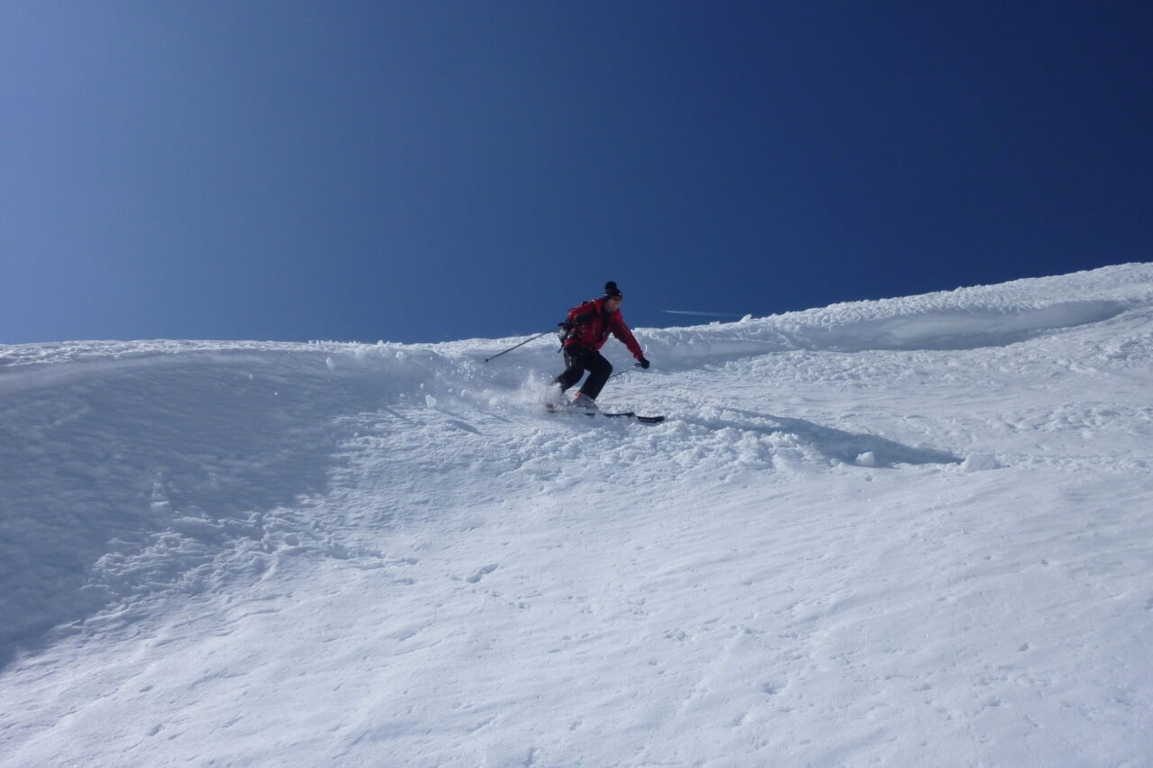 Einfache Orientierung, da der zu besteigende Piz Boè immer vor uns liegt. Bei der Abfahrt sind die Wegpunkte 4 und 5 zu beachten. Die Abfahrt führt über einen Südhang. Folgende Ausrüstung wird empfohlen: Produkte für alpine Sicherheit im Schnee, Tourenski, ggf. Steigeisen zum Aufstieg zum Piz Boè und Skitourenhelm. Es empfiehlt sich die Einkehr in das Rifugio Maria bei der Bergstation, welches nach Maria Piaz, der Pionierin des Tourismus am Pordoipass, benannt wurde. Beste Jahreszeit: Januar bis April. Uns erwarten kurze Stücke mit bis zu 45° Hangneigung.
