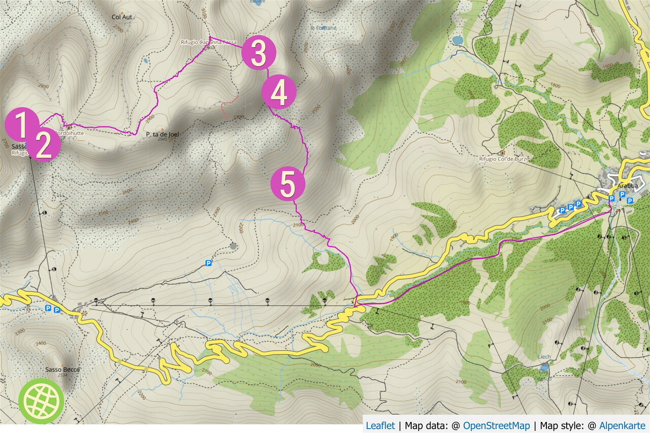 Geokoordinaten zum Start 46.495917 11.8746. Sie führen Dich nach Arabba, wo Du das Auto parkst und mit dem Lift weiterfährst.
