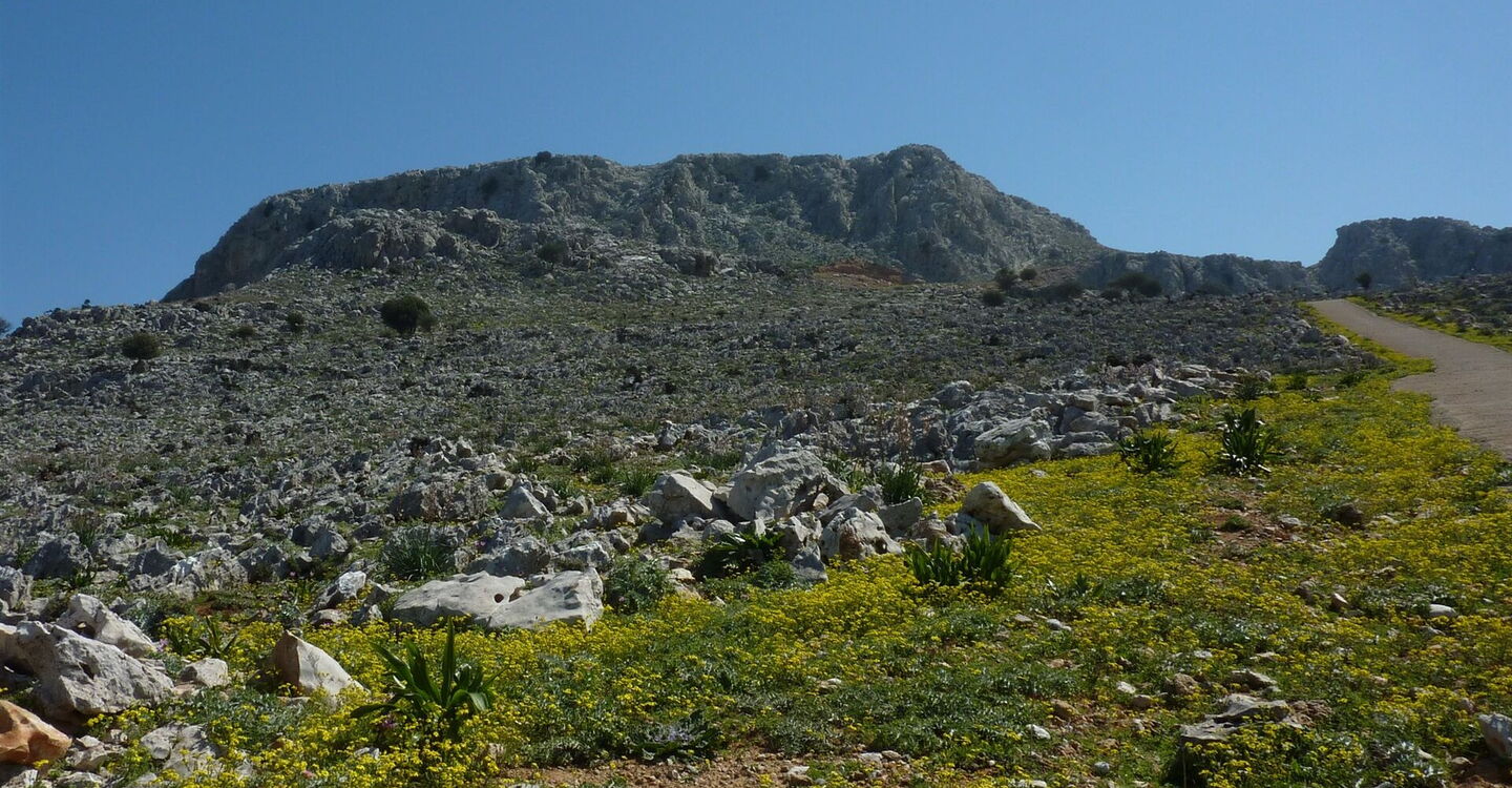 In langen Kehren führt die Betonpiste unterhalb der schroffen Felswand des Gipfelmassivs direkt bis auf das Plateau des (04) Profitis Ilias (516 m). Auf einem Pfad, der an der Kapelle vorbeiführt, erreicht man Ruinen. Von dort hat man den besten Ausblick über die weite Ägäis Richtung Osten, den 1260 m hohen Attaviros und den gleichnamigen, 798 m hohen Profitis Ilias im Westen.