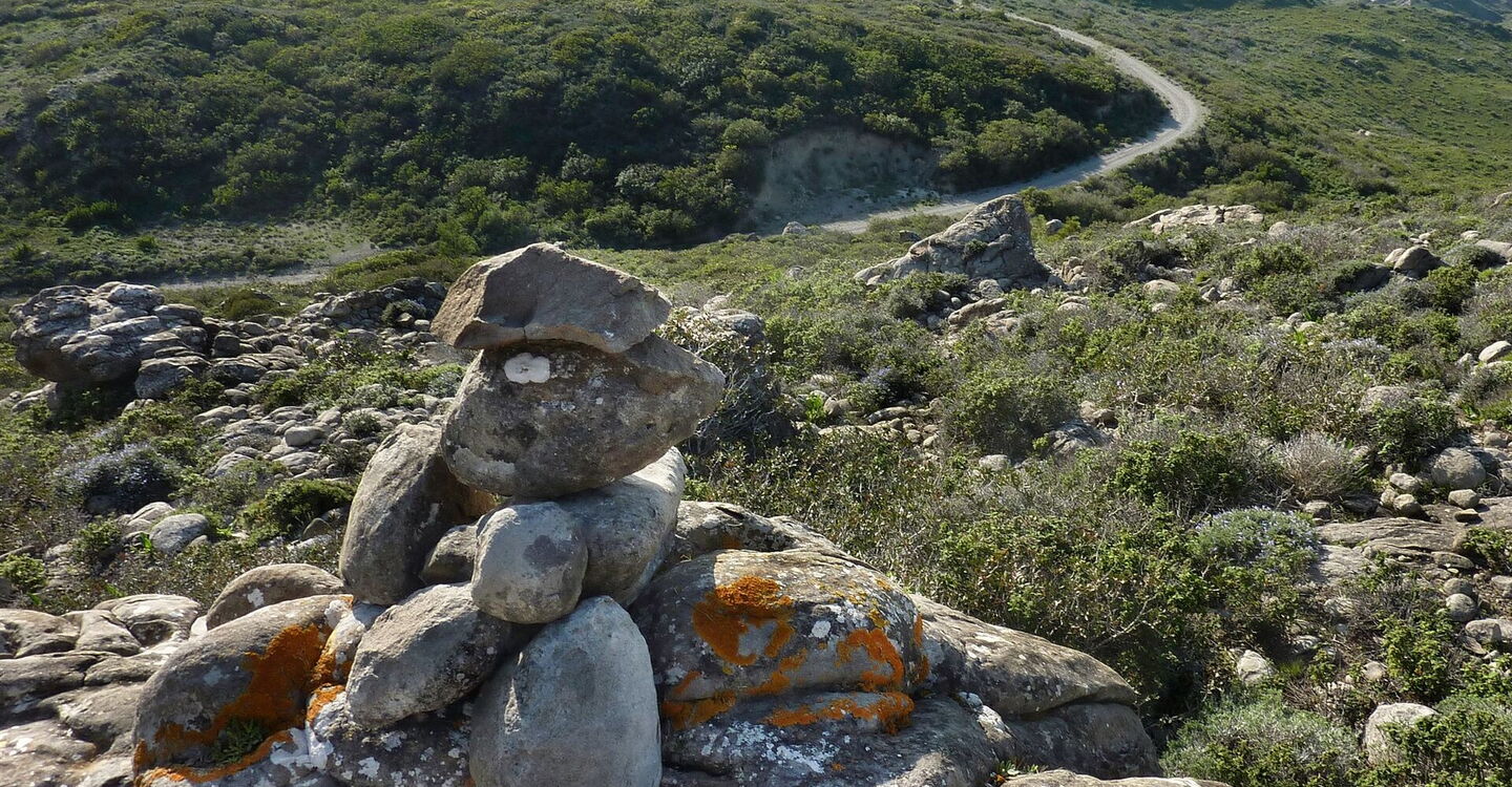 Wir passieren zwei Ziegenzäune und gehen nun in direkter Linie auf den zu besteigenden Berg und die dahinter liegenden Windräder zu. Wir erreichen die (02) Einsattelung (342 m) und können Richtung Westen und Osten das Meer ausmachen. Ein Steinmännchen markiert den Aufstieg auf dem Bergrücken in Richtung der Windräder. Auf einem gut ausgetretenen Ziegenpfad übersteigen wir schnell den ersten und den zweiten Hügel.