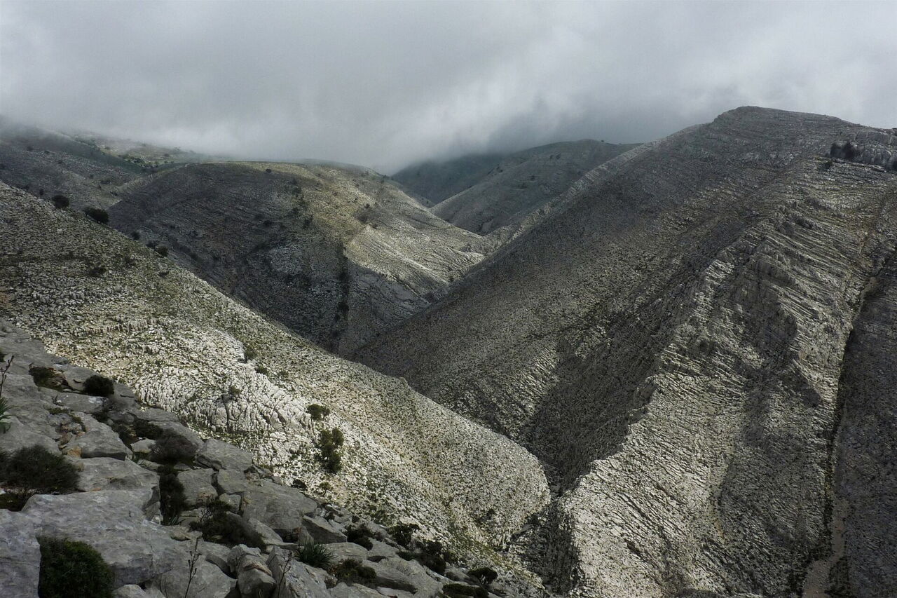 Wir queren zunächst auf einem nahezu ebenen Stück halb rechts den Hang, bis wir dann kontinuierlich an Höhe verlieren. Der Untergrund wird steiniger und wir passieren ein Trockenflussbett. Hier beginnen wir mit unserem direkten Abstieg über (04) Blockgestein (941 m), unter gelegentlicher Zuhilfenahme der Hände. Im Canyon angekommen, liegen 3,8 km Erlebnis vor uns.