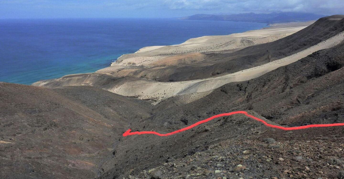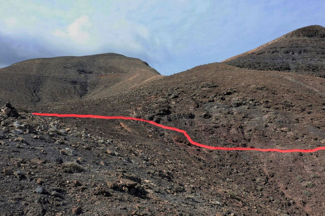 Nach nur 100 m Aufstieg auf einem schmalen Pfad gehen wir rechts auf dem vor uns liegenden (04) Bergrücken (190 m) mittig bergab. Nach weiteren 300 m steigen wir an einer günstigen Stelle in das Barranco hinab und folgen der Falllinie. Am Ende des Barrancos treffen wir auf einen Küstenpfad, dem wir links 400 m folgen.