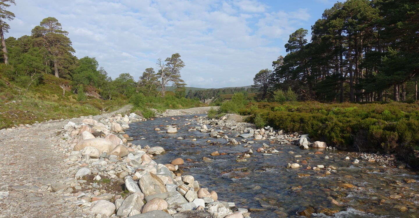In einer Senke ignorieren wir den linken Abzweiger und queren kurz später das Flussbett des 02 Quoich Water (450 m). Einen Abzweiger nach rechts ignorieren wir und gehen ein kurzes Stück parallel zum Flusslauf. In dem darauffolgenden Waldstück ignorieren wir den linken Abzweiger und beginnen auf einem angelegten Pfad mit dem Aufstieg. Bei guter Sicht erhebt sich vor uns ein lang gezogener Bergrücken, auf dem man den weiterführenden Wanderweg gut ausmachen kann. Nach gut 5 km ändert sich die Vegetationsstufe, wir haben den lichten Kiefernwald hinter uns gelassen. Nun geht es nur noch durch die karge Moor- und Heidelandschaft.