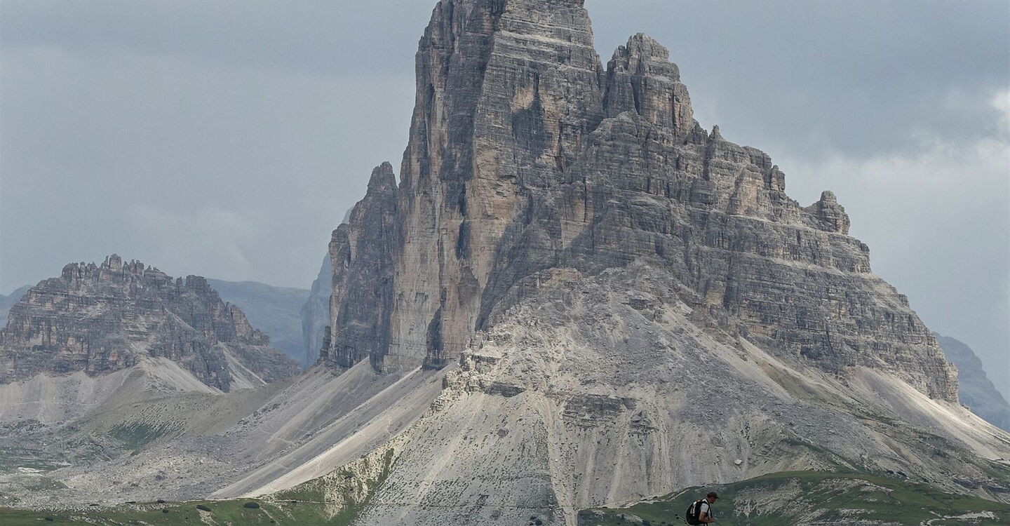 Bei guter Fernsicht ergibt sich bereits vom Berggasthof Plätzwiese eine faszinierende Aussicht auf die 3.146 m hohe Nordostflanke der Hohen Gaisl, die die Italiener aufgrund des auffälligen roten Gesteins Croda Rossa d’Ampezzo nennen. Vom Fuße dieses höchsten Gipfels der Pragser Dolomiten steigen wir ins Höhlensteintal herunter. Wir befinden uns nun im Reich der Sextner Dolomiten und steigen auf das Hochplateau zwischen dem Monte Piana und Monte Piano. Während des Gebirgskrieges (1915 bis 1917), oft auch Dolomitenkrieg genannt, zwischen Österreich-Ungarn und Italien war dies ein sehr umkämpftes Gebiet. Ca. 14.000 Soldaten, Österreicher und Italiener, ließen ihr Leben an diesem Berg. Am Nordgipfel (Monte Piano) hatten die Österreicher ihre Stellungen, am Südgipfel (Monte Piana) die Italiener. Zur Verteidigung wurden Tunnel, Stollen und Schützengräben errichtet, die heutzutage im Freilichtmuseum Monte Piana besucht werden können. Weitere Fundstücke können in der kleinen Sammlung des Rifugio Maggiore betrachtet werden. Auf dem verbliebenen Wegstück schauen wir direkt auf die Westflanke des meistfotografierten Berges und Wahrzeichens der Dolomiten – die Drei Zinnen (Tre Cime di Lavaredo).