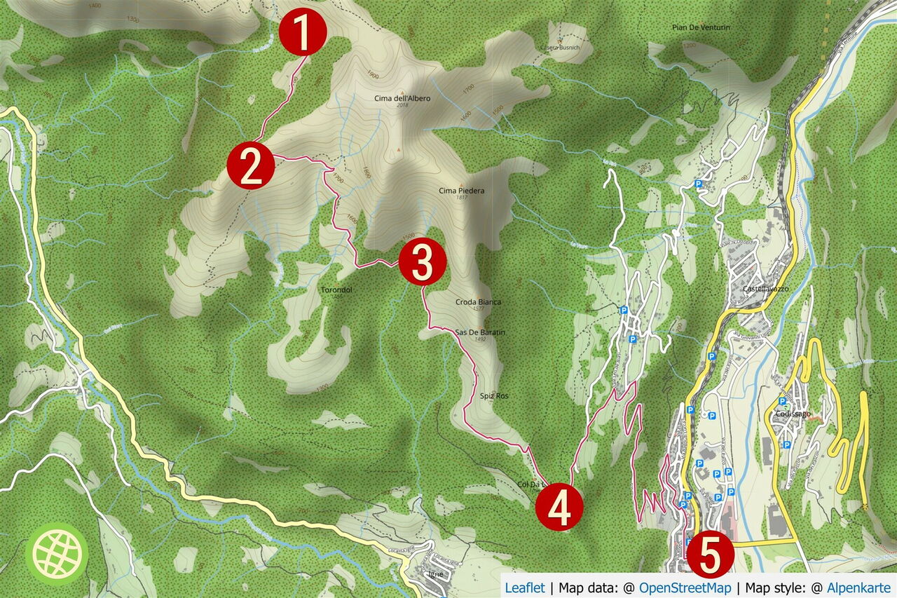 Vom 01 Bivacco Tovanella (1.688 m) folgen wir dem schlecht zu erkennenden weiterführenden Pfad. Es gibt zwar keine entsprechenden Hinweise, aber es handelt sich um den Wanderweg 482, auf dem man nur wenige rote Markierungen findet. Wir steigen nicht nach rechts in das Tal ab, sondern gehen leicht ansteigend in südwestliche Richtung, um unterhalb von Felsen auf einem nun gut zu erkennenden Pfad durch einen lichten Wald aufzusteigen.