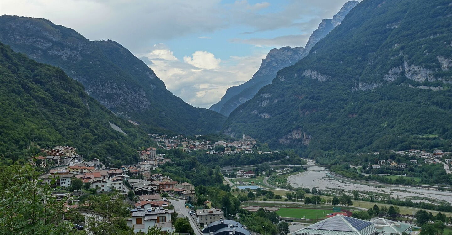 Bei einer kleinen Kapelle gehen wir nicht nach halb links in die Stichstraße, sondern biegen bei der nächsten Möglichkeit scharf rechts ab – hier befindet sich auch ein Wegweiser Richtung Longarone – und gehen nun auf dieser gering befahrenen Straße kontinuierlich bergab. Auf vielen Wegen erreicht man die Bushaltestelle und den 05 Bahnhof von Longarone (444 m).