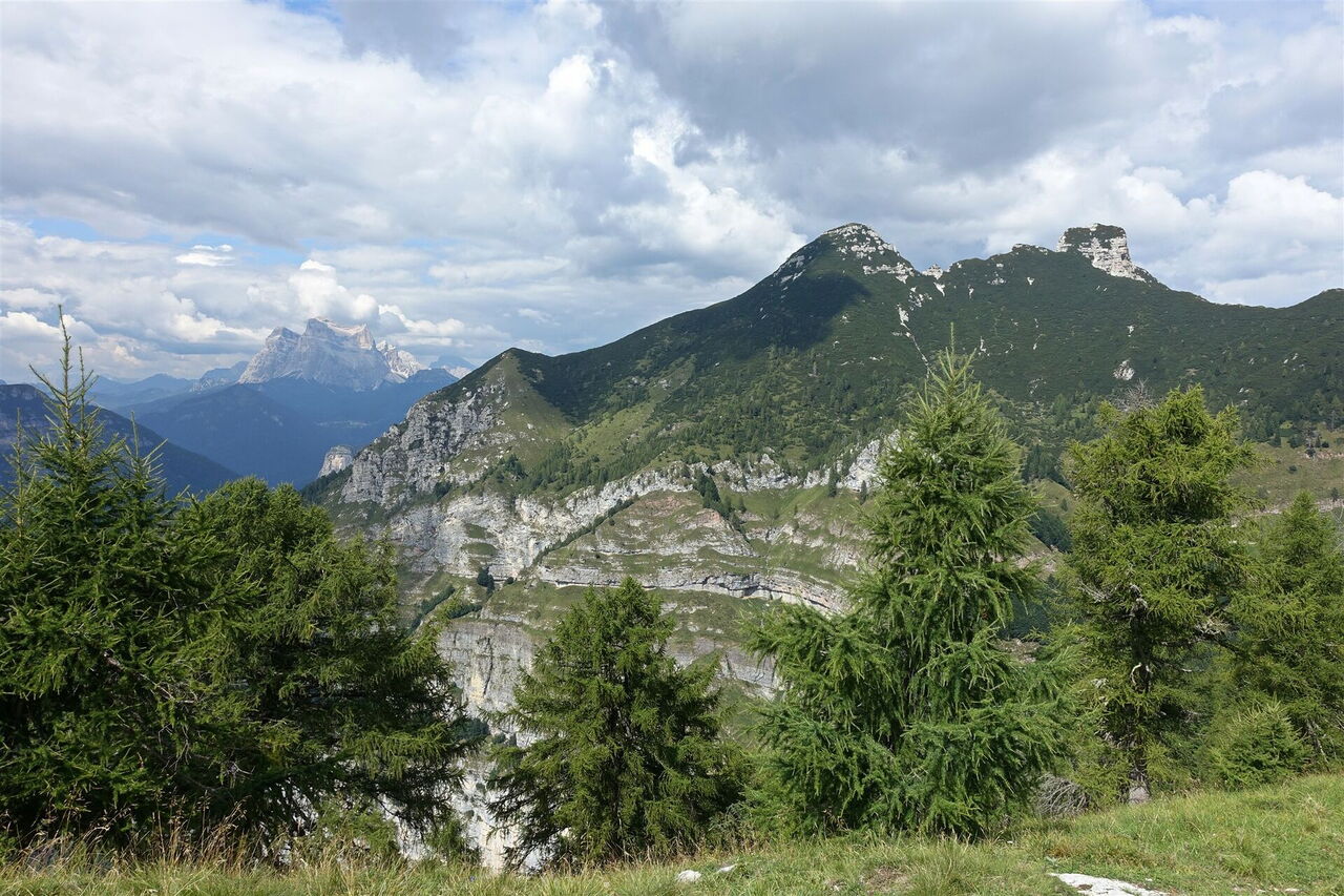 Wir erreichen den baumlosen 02 Passo Dou (1.840 m), Richtung Norden erhebt sich der mächtige Monte Pelmo und links davon die Civetta. An der Gabelung der beiden Pfade gehen wir nicht halb links auf einem Höhenweg weiter, sondern halb rechts, von nun an geht es kontinuierlich bergab. Rechts unterhalb befindet sich das weitläufige Zoldotal. Wir ignorieren einen rechten Abzweiger und hinter einem großen Steinhaufen einen nach links abzweigenden Pfad.