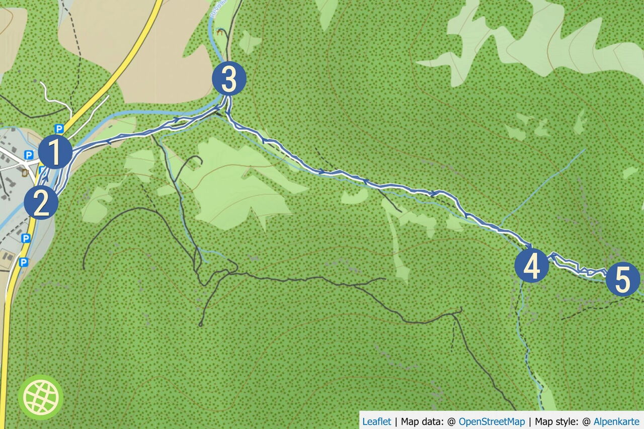 Hinter zwei Brücken gabelt sich der Weg. Der rechte 04 Abzweiger (726 m) führt durch eine weitere Schlucht bergauf, zu den Quellen Prameň Brankovský vodopád, die den Wasserfall speisen. Wir gehen links an der Informationstafel vorbei.