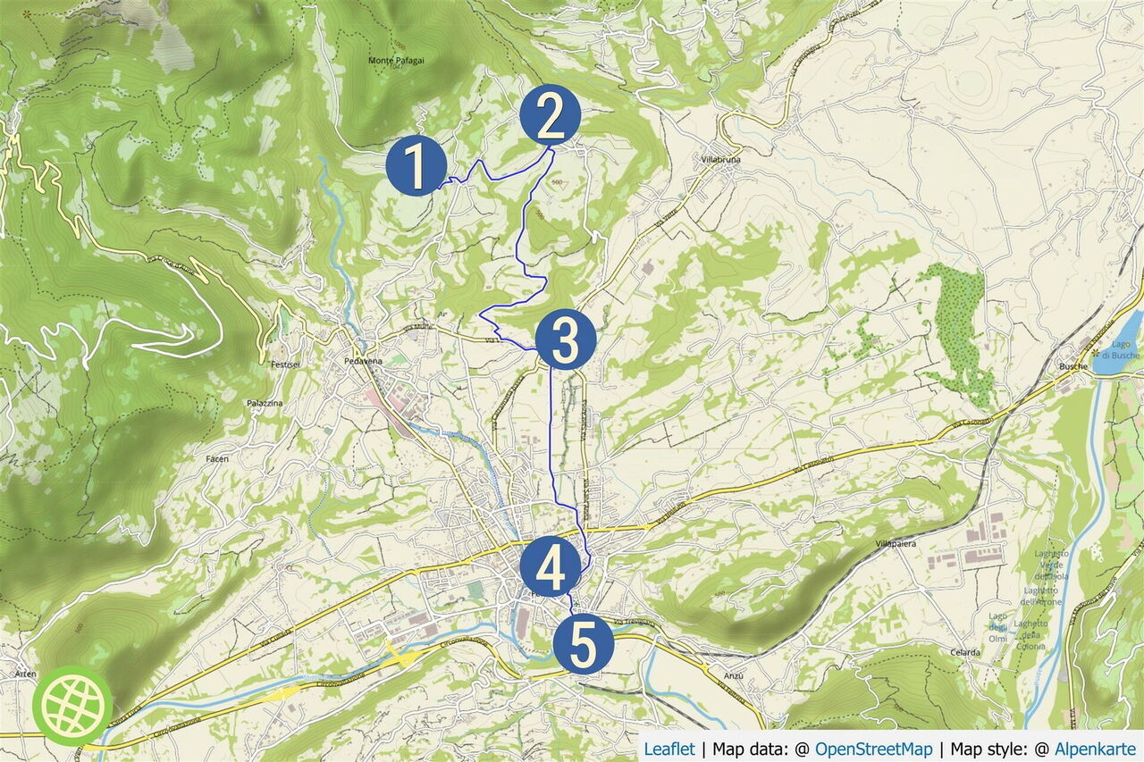 In dem Dorf Lamen gehen wir von der 01 Bushaltestelle Lamen (532 m) in östlicher Richtung auf der gering befahrenen Straße an der Pizzeria La Caliera vorbei. In der nachfolgenden Ortschaft Pren folgen wir nicht rechts bergab der Ausschilderung nach Pedavena, sondern wandern halb links weiter durch die Ortschaft Pren. Auf Höhe des links von uns liegenden Friedhofs sehen wir in der Ferne einen Kirchturm auf einem Hügel. Nachdem wir ein kleines Waldstück verlassen haben, sehen wir abermals den Kirchturm, an dieser Stelle zweigt rechts die Via Don ab.