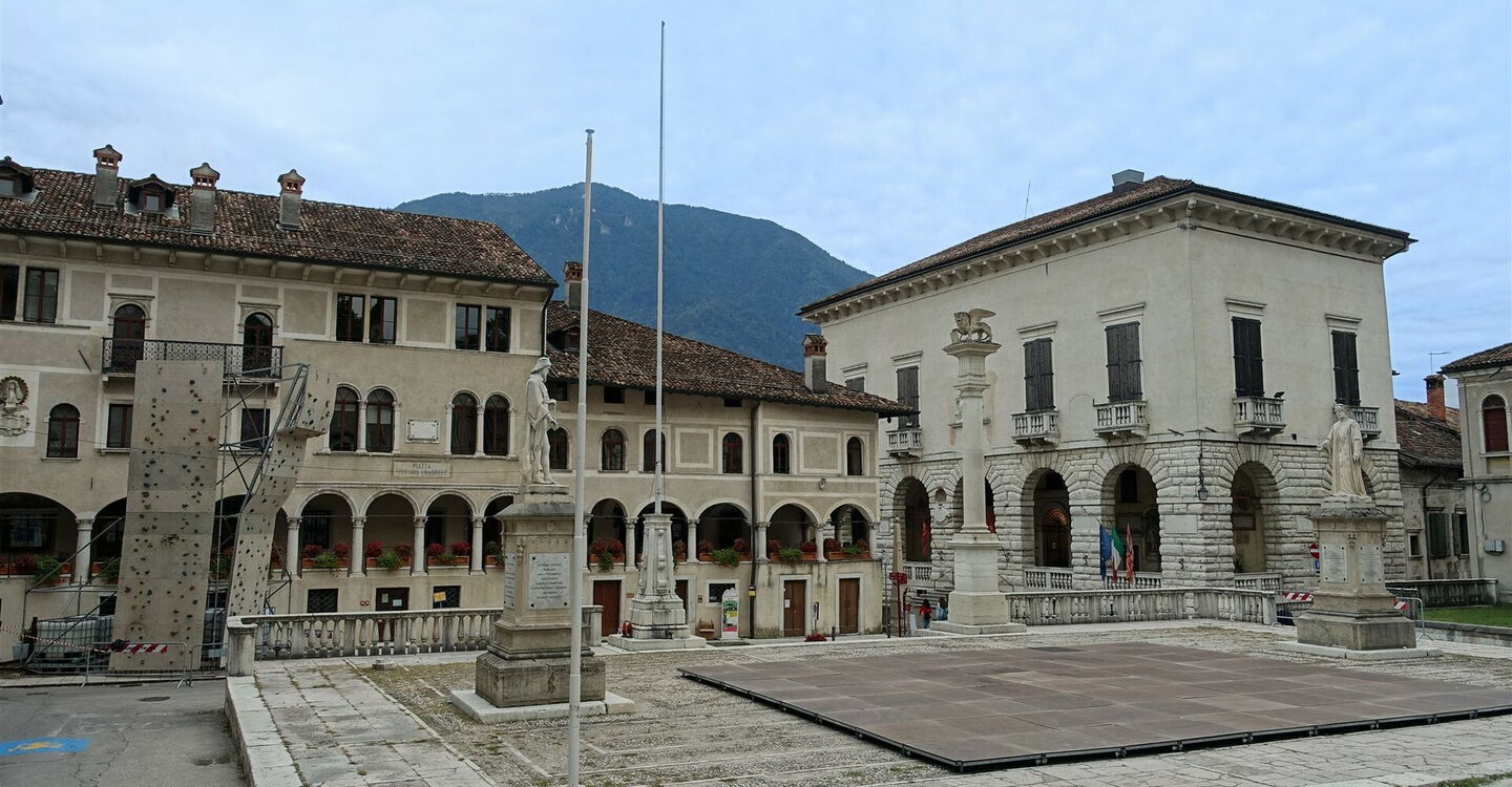 Die nachfolgende Hauptstraße überqueren wir und gelangen so in eine Sackgasse. Dort, wo die Straße eine Rechtskehre macht, gehen wir geradeaus auf der nachfolgenden Piste weiter. Kurz später endet die Piste an einer Straße, die wir nach halb links überqueren, um auf der Via Vespucci weiter Richtung Feltre zu gehen. Die Straße endet vor dem Krankenhaus von Feltre, wo wir links auf der Straße weitergehen. Wir folgen deren Verlauf bis zur Hauptdurchgangsstraße, die wir über den Zebrastreifen überqueren, sodass wir geradeaus in die Einbahnstraße Via Ligot gelangen. Wir passieren zwei Stoppschilder, um dann bei dem dritten Stoppschild rechts in die Via Lorenzo Luzzo abzubiegen. Durch das Porta Oria lassen wir die Schutzmauern aus dem 15. Jahrhundert hinter uns und gelangen im Weiteren zur 04 Piazza Maggiore (266 m).