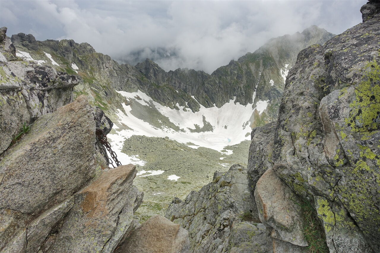 Der finale Aufstieg zur Einsattelung ist extrem steil, selbst im Juni befinden sich hier noch Restschneefelder, die gequert werden müssen. Da die Route jedoch oft begangen wird, ist meist eine ausgetretene Spur vorhanden und Steigeisen sind in der Regel nicht notwendig. Die letzten Meter bis zum 03 Bystrá lávka (2300 m) sind dann mit einer Kette gesichert. Durch eine Felsspalte schlüpft man auf die andere Seite des schmalen Grats. Sehr spektakulär! Bei guter Sicht schaut man direkt in die Gipfelregion des 2494 m hohen Berges Kriváň, dem Nationalsymbol der Slowakei. Siehe Wanderung 38.