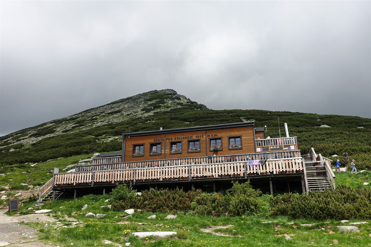 Nach längerem Abstieg befinden wir uns bereits im Reich der Latschenkiefern und erreichen eine Wegverzweigung mit Wegweisern. Geht man hier geradeaus weiter – siehe Beschreibung Wanderung 42 –, so gelangt man ebenfalls zum Ausgangspunkt. Wir gehen aber links und erreichen nach kurzem Aufstieg die 05 Chata pod Soliskom (1840 m). Von dort könnte man mit dem Sessellift ins Tal fahren. Durch eine breite Schneise zwischen den Latschenkiefern – die Skipiste – führt ein mit Felsen verlegter Wanderweg in Richtung der beiden Sprungschanzen. Oberhalb des nachfolgenden Schlepplifts gehen wir geradeaus weiter und nicht links ins Tal. Genau an der Stelle, wo der Schlepplift eine 90°-Linkskehre macht – hier ist die Streckenführung nicht eindeutig –, gehen wir geradeaus weiter und gelangen so auf einen breiten Pfad, der am Štrbské Pleso endet. Von hier gehen wir links am Ufer des Sees entlang und vor dem Restaurant Koliba Patria abermals links, um dann auf den bekannten Hinweg zu gelangen.