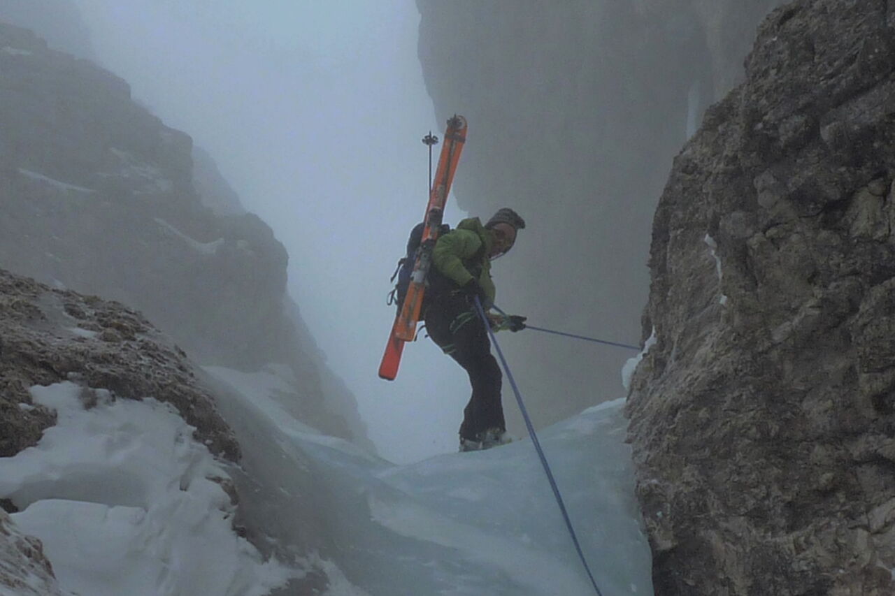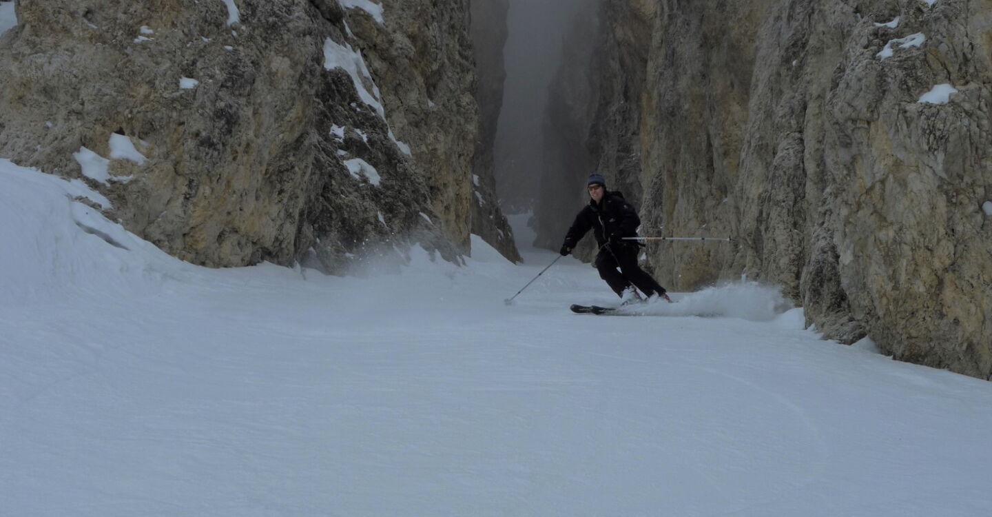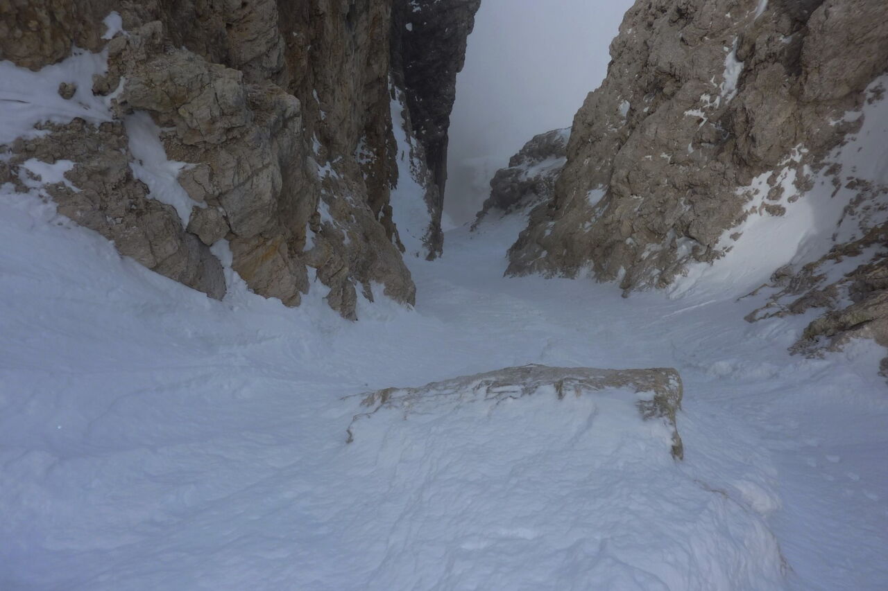 Mein GPS hat in der Scharte versagt. Aber einmal drin, gibt es keinen anderen Weg mehr als hinunter. Die Abfahrt führt über einen Nordhang. Folgende Ausrüstung wird empfohlen: Produkte für alpine Sicherheit im Schnee, Freerideski, Klettergurt mit 20m Kletterseil, Steigeisen und Pickel und Skitourenhelm. Es empfiehlt sich die Einkehr in das Rifugio Maria bei der Bergstation, welches nach Maria Piaz, der Pionierin des Tourismus am Pordoipass, benannt wurde. Beste Jahreszeit: Januar bis April. Uns erwarten kurze Stücke mit bis zu 50° Hangneigung.