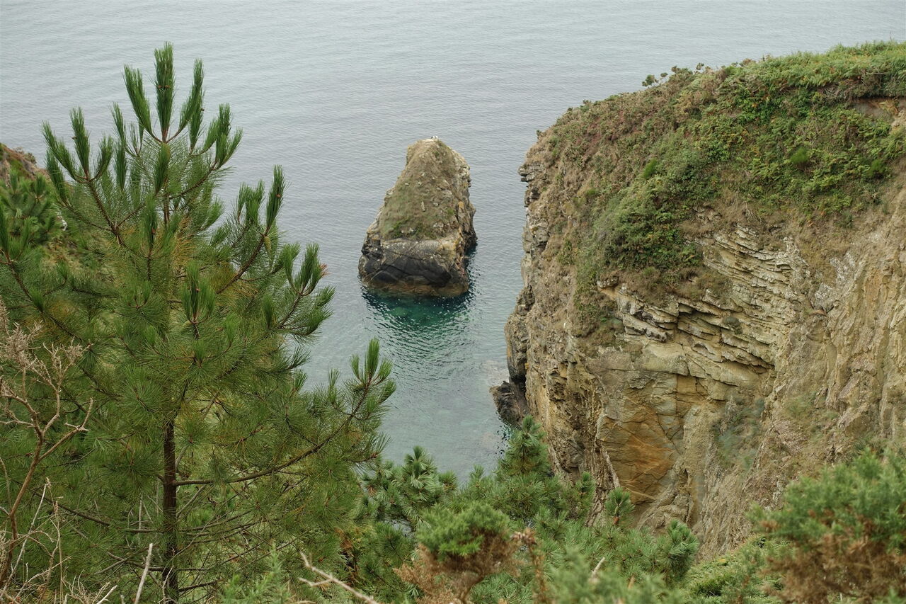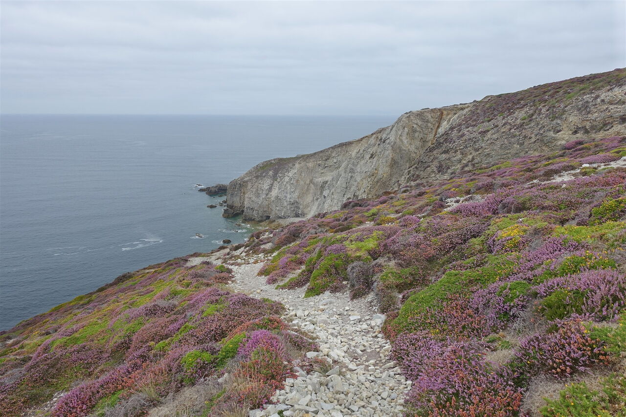 Wir erreichen einen großen Stein mit einer Inschrift, hier treffen wir auf den 02 Zöllnerpfad (84 m) und folgen ihm fortan nach rechts. Dort, wo der Pfad endet, gehen wir rechts weiter. Auf der spektakulären Streckenführung oberhalb der Steilküste queren wir einen weiteren Kiefernwald. Im August wandert man hier durch eine blühende Heidelandschaft. Nach kurzem Aufstieg mündet der Pfad in einen weiteren Pfad, hier befindet sich auch ein Gedenkstein. Wie ein ausgelegter Bindfaden zieht sich der weithin sichtbare Wanderweg durch die Küstenlandschaft. Wir erreichen einen gesicherten Aussichtspunkt: Man blickt über die Bucht von Douarnenez zum 18 km entfernten gleichnamigen Hafenort und zur 8 km entfernten Landzunge Cap Sizun.