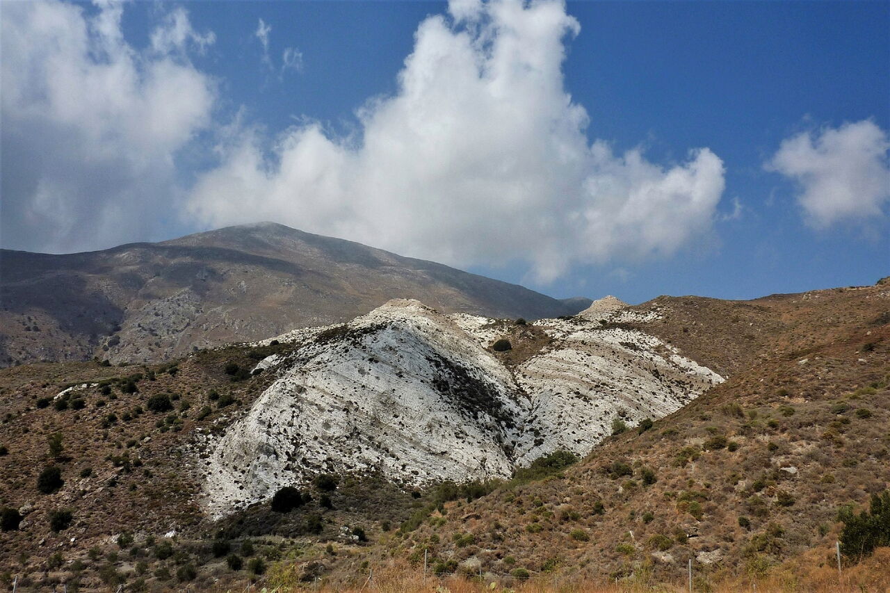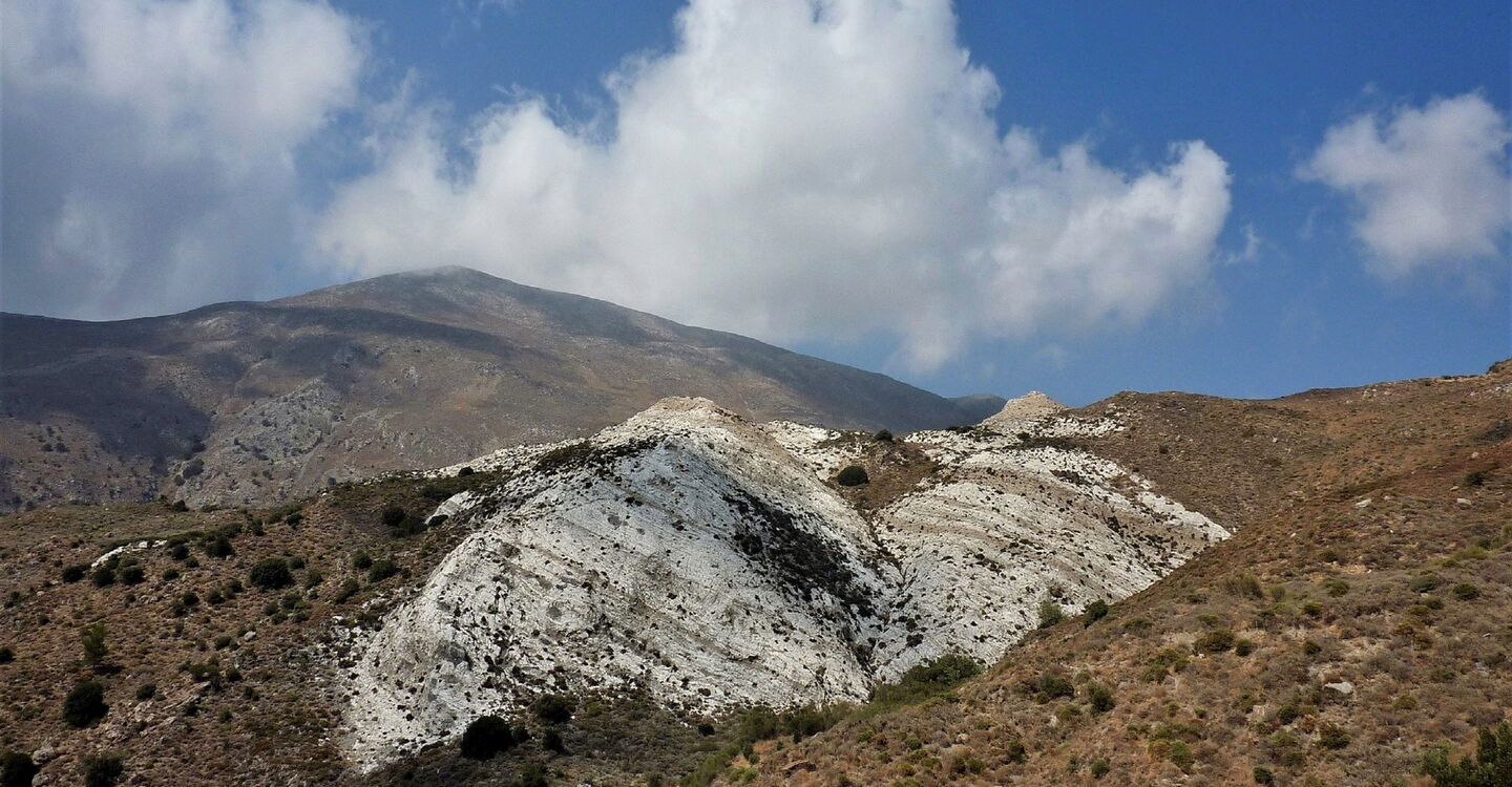 Auf dem folgenden Wegstück befinden sich viele E4-Markierungen. Kurz nach einer Anhöhe folgen wir der rechts abzweigenden Schotterpiste und gehen direkt auf einen großen weißen, sehr markanten Felsen zu. Unser Weg endet, hinter einer Kette führt links ein Weg bergauf, wir gehen aber halb links, talauswärts, bis zur Hauptstraße vor. Von dort gehen wir links bis zum heutigen Etappenziel 05 Chrisopigi (396 m).