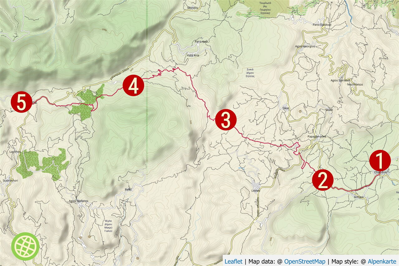 Vom Dorfplatz in 01 Chandras (585 m) gehen wir auf der Dorfstraße zur Hauptstraße hinunter. Am Kreisverkehr nehmen wir die erste Straße rechts und nach 580 m bei der folgenden Weggabelung nicht in die Einbahnstraße, sondern bleiben halb rechts auf der Hauptstraße, bis sie endet.