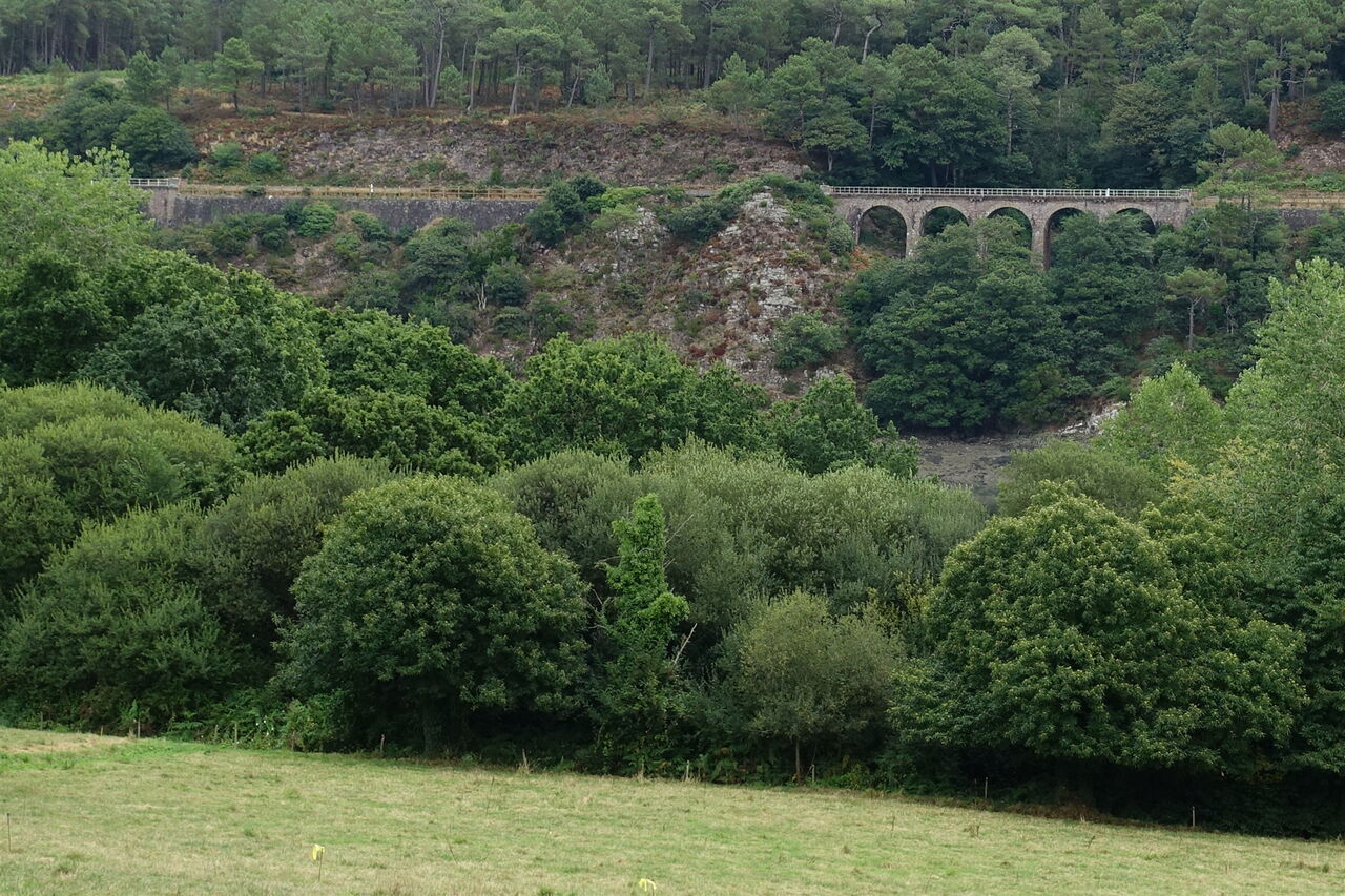 Bei einer Weggabelung gehen wir halb rechts und erreichen nach einigen Metern den 04 Aussichtspunkt Rocher argénté (4 m). Rechts oberhalb thront das Schloss mit seinen zahlreichen Schornsteinen. Auf der gegenüberliegenden Uferseite befindet sich ein Eisenbahnviadukt, über das in den Sommermonaten der Nostalgiezug La Vapeur du Trieux auf der Strecke Paimpol – Pontrieux – Paimpol verkehrt, ein liebevoll restaurierter Museumszug mit Dampflok und fünf alten Wagen. Im historischen Bahnhof von Paimpol beginnt die Reise in die Vergangenheit. An einer Weidefläche angekommen, verlässt der Pfad den Flusslauf und führt links bergauf.