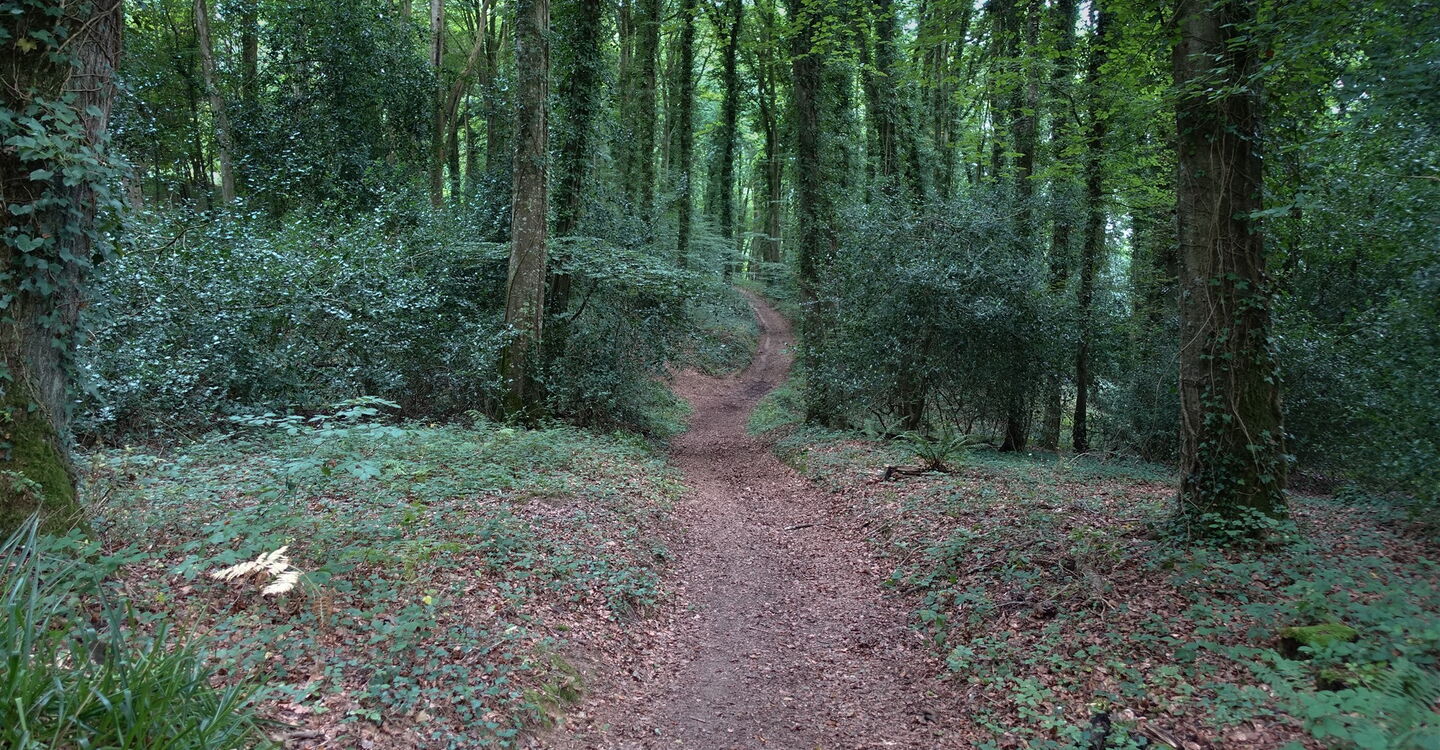 Der Aufstieg erfolgt entlang eines Bachlaufes und wir queren eine Piste. Sobald wir halb rechts ein Haus sehen, gehen wir auf dieses zu, biegen dann aber vor der Steinmauer halb links auf einen schmalen und meistens feuchten Pfad ab, der durch den 05 Wald de la Roche-Jagu (52 m) führt. Der Pfad mündet in einen Wirtschaftsweg. In der nachfolgenden Rechtskehre des Weges gehen wir aber geradeaus auf einem Pfad weiter. Die folgende Kreuzung überqueren wir und je nachdem, wo wir geparkt haben, gehen wir rechts zum Parkplatz und Ausgangspunkt.