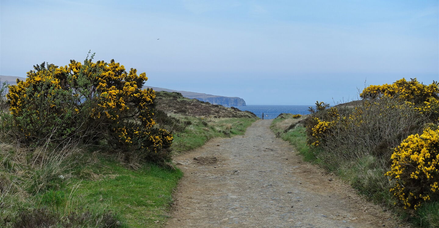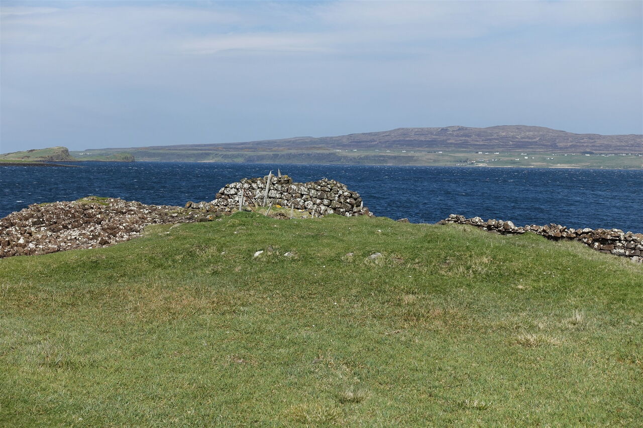 Bei einem einzelnen Haus und der darauffolgenden Pforte geht es dann auf einer Piste weiter. Einen links bergauf führenden Weg ignorieren wir, kurz später passieren wir ein weiteres Gatter. Achtung! Bei einer Linkskehre der Asphaltstraße – hier befindet sich ein mintgrüner abgestellter alter Lastwagen – verlassen wir die Straße nach halb rechts. Vor einem einzelnen Haus verläuft der Pfad halb rechts Richtung Meer. Wir erreichen die Bucht von 02 Kilmarie (3 m), einst Heimat von Iain Anderson, dem Frontmann von der 1967 gegründeten Band Jethro Tull. An der Hauptstraße B8083 biegen wir links ab und gehen bis zu einem Parkplatz vor.