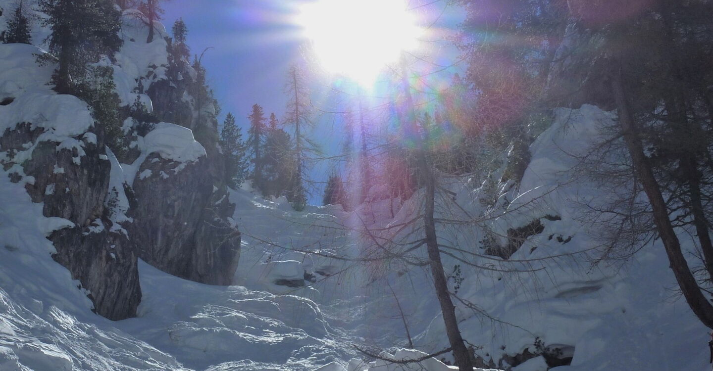 Um die Mittagszeit steht die Sonne direkt über dem schmalen Taleinschnitt. Und wir hatten als Erster eine sensationelle Tiefschneeabfahrt!