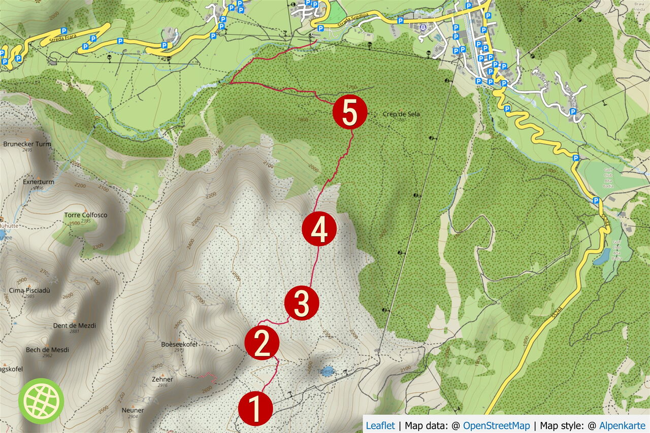Geokoordinaten zum Start 46.550617 11.856117. Sie führen Dich nach Covara, wo Du das Auto parkst und mit dem Lift weiterfährst.
