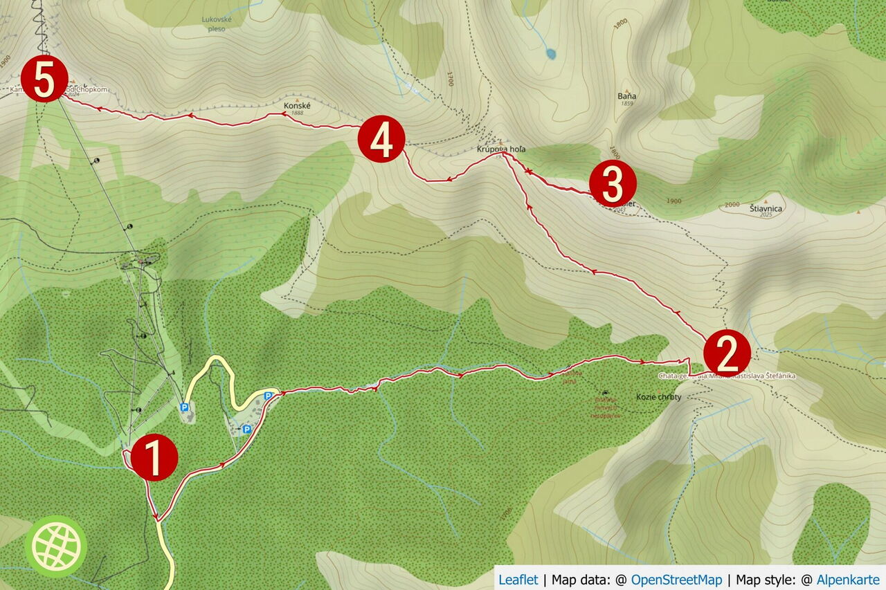 Charakter: Benötigt werden elementare alpine Erfahrung sowie Trittsicherheit und Schwindelfreiheit. Bei einem Wettersturz ist der Rückzug schwierig. Art des Weges: 100 % Pfad. Zusatzausrüstung: Keine. Einkehr: Km 3,3 Milan-Rastislav-Štefánik-Schutzhütte und Km 10,5 Kamenná Chata pod Chopkom. Beste Wanderzeit: Ende Mai bis Ende Oktober. Sehenswert Region: Am Hauptplatz der Stadt Brezno der Stadtturm von 1830, die Mariensäule von 1741 und eine römisch-katholische Kirche von 1781 bis 1785 mit barock-klassizistischer Inneneinrichtung. Variante 1: Man kombiniert die Touren 4 und 5. Fakten: 8 Std., 23,2 km und Anstieg/Abstieg: 1460/1830 m. Variante 2: Berg- und Talfahrt mit der Seilbahn und man läuft den Weg von der Einsattelung (WP 03) bis zum Gipfel des Ďumbier (WP 05) hin und zurück. Fakten: 3 Std., 8,4 km und 500 Höhenmeter.