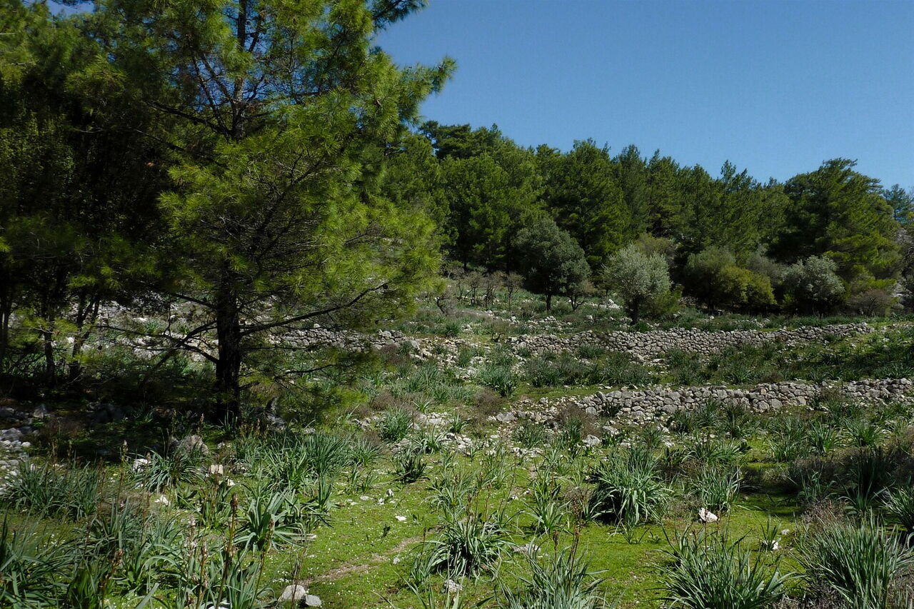 Wir gehen auf der Asphaltstraße zurück, um 300 m hinter dem Wassertank, bei Bienenkörben, links auf der bergab führenden (05) Schotterpiste (516 m) weiterzuwandern. Durch einen wildromantischen Wald geht es entlang eines Bachlaufes und vorbei an einem künstlerisch gestalteten Ziegenhaus. Unsere Piste mündet in eine weitere Forstpiste, während wir uns links halten. Im weiteren Verlauf lichtet sich der Kiefernwald, wir erreichen Olivenhaine und gehen bei der Asphaltstraße links zur Kapelle zurück.