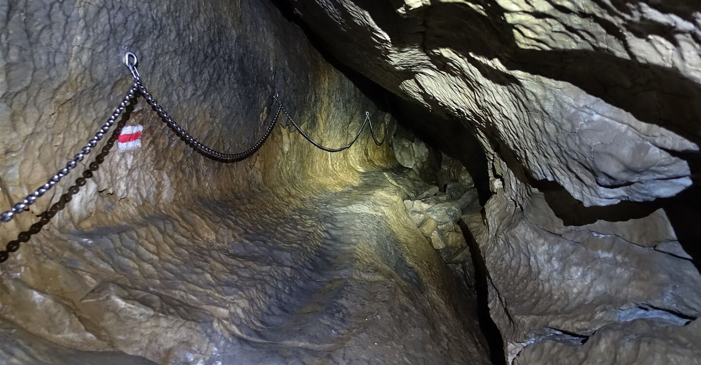 10 m hinter einer Steinbrücke mit einem Geländer zweigt links der ausgezeichnete Pfad zur Höhle 05 Jaskinia Raptawicka (1099 m) ab. Diese kann ohne Führer erkundet werden. Wir folgen dem steil bergauf führenden Pfad. Bei der ersten Weggabelung gehen wir nicht rechts Richtung Gipfel, sondern halb links. Wir kommen unterhalb von Felsen an einer ersten Höhlenöffnung vorbei, um dann bei der nächsten Höhle den roten Markierungspfeilen zu folgen. Freude und Erleichterung kommen auf, wenn man das Tageslicht am Ende der Höhle sieht! Wir steigen auf einem schmalen Pfad zum Hauptweg ab und folgen diesem bis zum Ausgangspunkt.