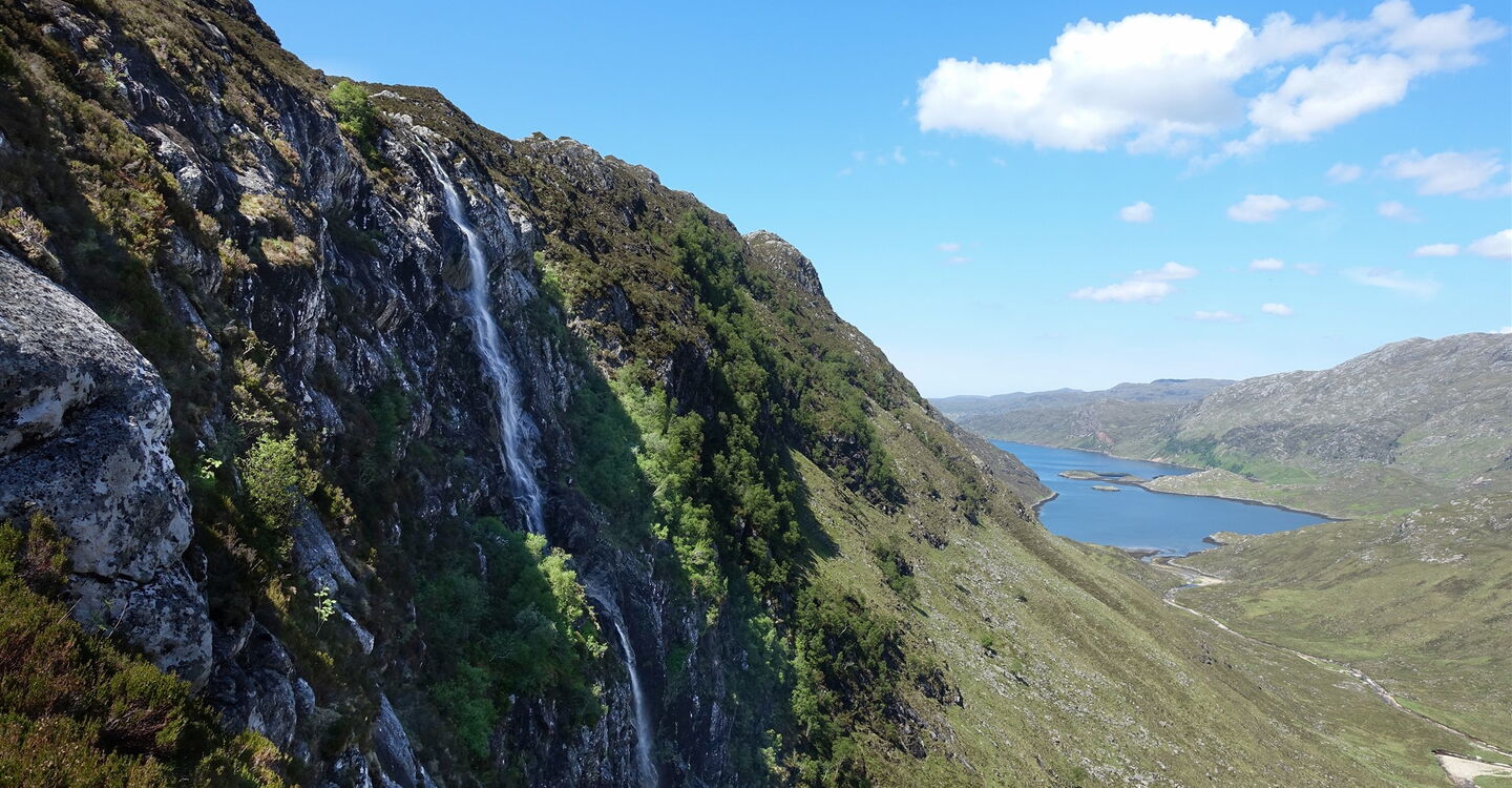 Diese Wanderung führt in die spektakulären Berge von Assynt. Es geht vorbei an idyllisch gelegenen Seen und rauschenden Bächen sowie durch 1700–3000 Millionen Jahre altes Lewisiangestein bis zu einem perfekten Aussichtspunkt auf den höchsten Wasserfall Großbritanniens – man sieht die kompletten 200 m Fallhöhe. Danach wird ein Corbett auf einer aussichtsreichen Runde bestiegen. Der Abstieg erfolgt durch eine traumhaft schöne Landschaft, Garant für perfekte Erholung.