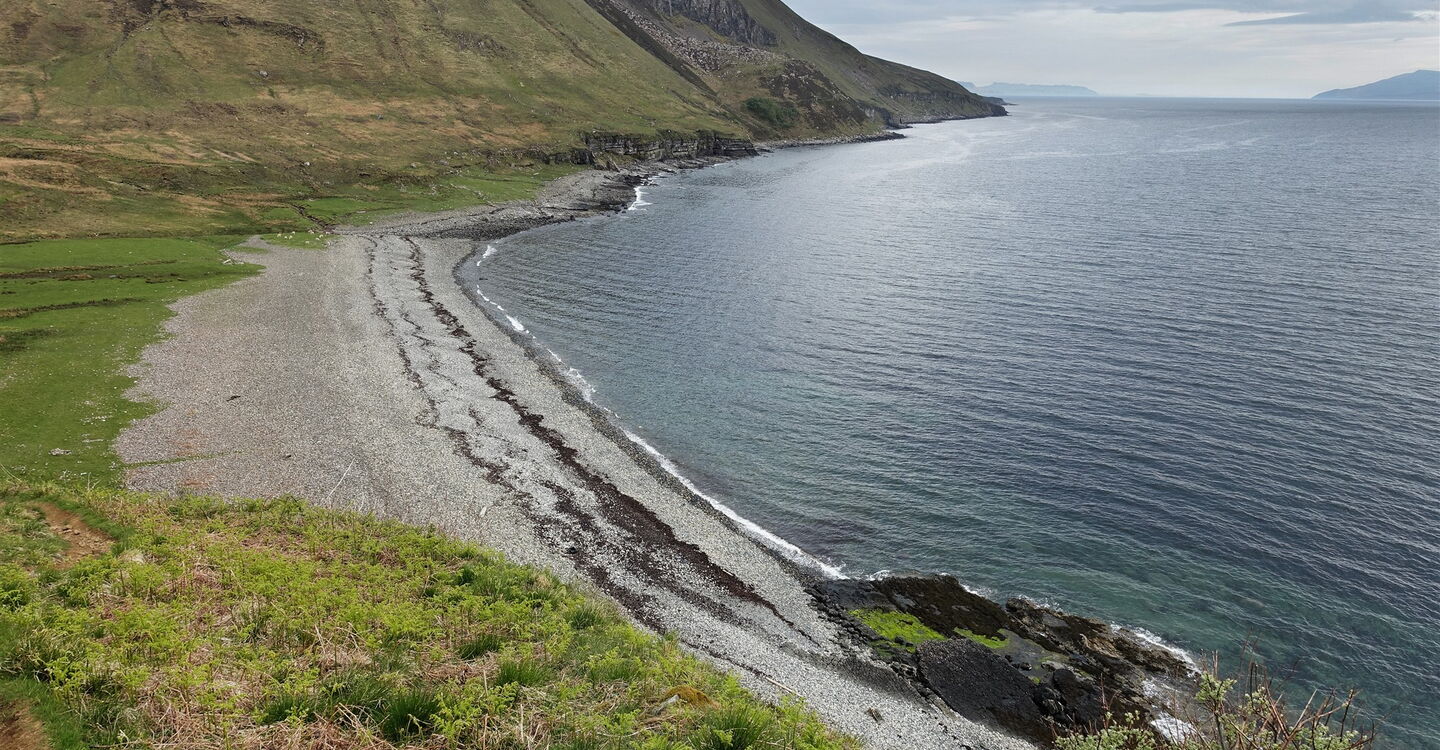 Dort folgen wir dem ausgezeichneten und perfekt angelegten Wanderweg Richtung Camasunary-Bucht. Sobald man den Mam Pass erreicht hat, ergibt sich eine herrliche Aussicht auf die felsige Gebirgslandschaft der Cuillins. Bei guter Sicht lässt sich der höchste Gipfel der Cuillins und der Insel Skye, der 992 m hohe Sgùrr Alasdair, ausmachen. Nach dem Abstieg erreichen wir die 03 Camasunary Bay (14 m). Sattgrüne Weiden und eine hellsandige Bucht stehen im Kontrast zu den schwarzen Gipfeln des Cuillin-Hauptkamms.