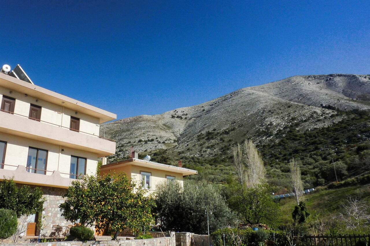 Vom (01) Start und Ziel beim Hotel Attaviros (433 m) gehen wir direkt neben dem Verkehrsspiegel halb rechts auf der betonierten Piste bergab und verlassen diese in der folgenden Rechtskurve geradeaus – dabei gehen wir rechts an einer kleinen Ruine vorbei. Mauern rechts und links des Weges begrenzen teilweise den alten Weg vom Dorf zu den Feldern. Schon bald sehen wir von unserer Position auf dem leicht ansteigenden Pfad links oberhalb einen Souvenirladen. Wir treffen bei einem Hundezwinger auf eine Schotterpiste, der wir scharf links folgen, um nach 120 m rechts auf dem ansteigenden Bergrücken weitere 70 m über eine Freifläche aufzusteigen. Drehen wir uns um, so ergeben sich traumhafte Blicke über das Dorf Embona, den dahinter liegenden Berg Profitis Ilias – zu erkennen an den Funkmasten – und halb rechts von uns auf den höchsten Berg der Insel, den 1216 m hohen Attaviros.