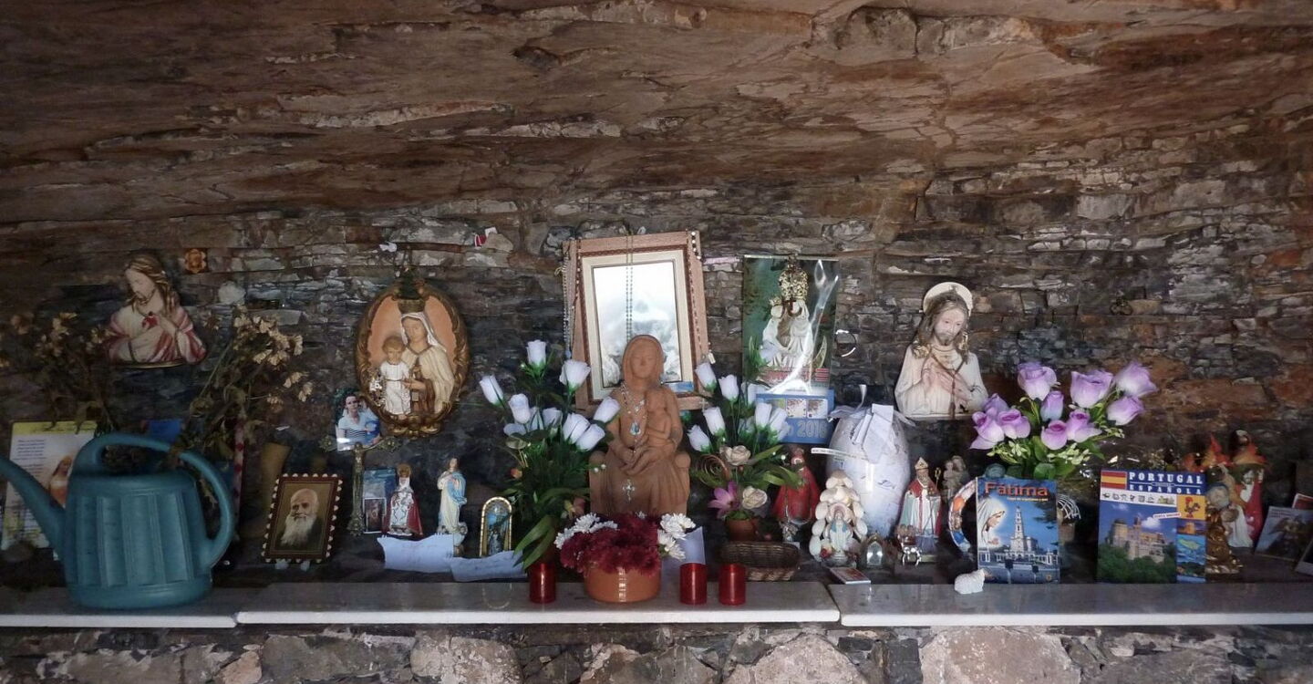 Dazu folgen wir der (02) Schotterpiste (404 m), die sich gemächlich bergauf schlängelt. Bei einem senkrecht stehenden Metallpfeiler endet die Piste und wir gehen auf dem links beginnenden Pfad auf einem Bergrücken, bis wir auf den ursprünglichen Hauptweg treffen. Diesem folgen wir rechts weiter bis zur Wallfahrtskirche, der Ermita de la Virgen de El Tanquito. Anfang des 20. Jahrhunderts wurde an dieser Stelle eine Quelle zur Wassergewinnung freigelegt. Als einige Bewohner des Ortes am Berg die Figur der Jungfrau de El Tanquito sahen, entstand die heutige Wallfahrtskirche. Nach der kleinen Erkundung geht es weiter auf dem Pfad, wir öffnen und schließen ein zweites, südlich gelegenes Ziegengatter.