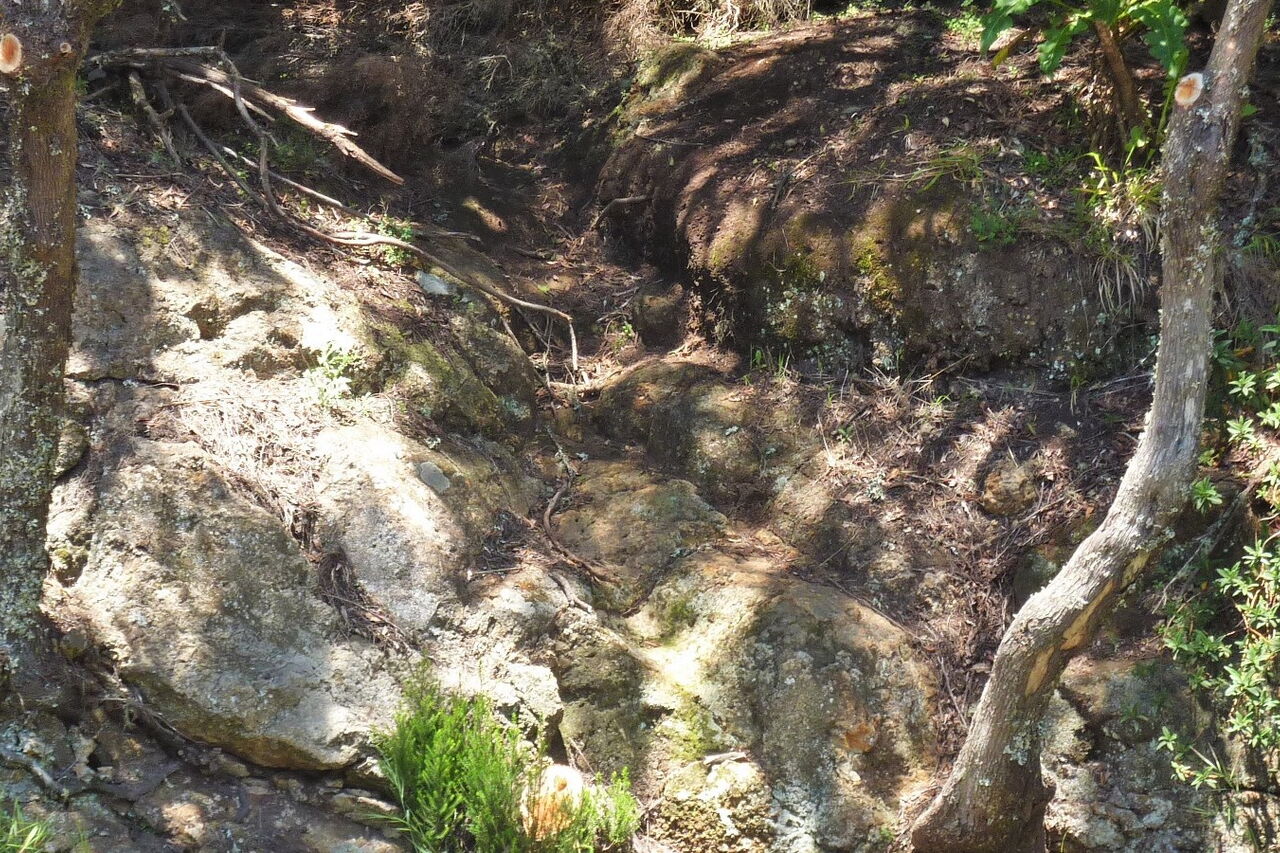 Nachdem wir die 1. Naturschönheit bewundert haben, eine basaltische Intrusion, folgt das 2. bewundernswerte Naturspektakel zugleich - ein 7 × 2 m Felsbrocken. Er hat keinen festen Kontakt zur unteren Gesteinsschicht, er sieht eher aus, als ob er an diese Fundstelle gerollt ist, er ist grün, aufgrund der Witterungseinflüsse, aber nur mäßig gespalten oder zerklüftet. In Deutschland würde man an einen riesigen Findling denken, das ist aber definitiv nicht zutreffend für die Kanarischen Inseln. Die Vermutung liegt nahe, dass fließfähiges Magma in einen Hohlkörper gedrungen ist, und dass der Mantel des Hohlkörpers durch Erosion abgetragen wurde, und so die riesigen Magmafelsbrocken entstanden. In früheren Zeiten waren so riesige Felsen Anlass für Sagen und Legenden, Hinweise dazu findet man nicht in der Literatur über La Gomera. Es bleibt ein rätselhaftes Vorkommen!