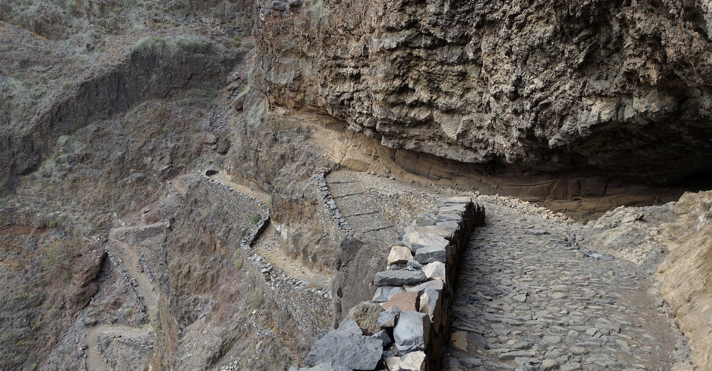 Die Insel Santo Antão ist bekannt für seine einmaligen Caminhos. Besonders sticht der Caminho zwischen Figueiras und Chã de Igreja heraus, denn es gab architektonische Hindernisse, die die Umsetzung dieses Caminhos erschwerten. Aufgrund zweier mächtiger, bis zu 567 m hohen Bergrücken, die als steile Felsklippen zum Atlantischen Ozean abbrechen, konnte man keinen Pfad entlang der Küstenlinie planen. So blieb nur die Möglichkeit, einen Weg durch das hügelige Hinterland, mit seinen tiefen Schluchten und hohen Pässen, zu finden. Das Resultat ist der heutige, immernoch intakte Caminho. Von jeder Einsattelung eröffnet sich ein umwerfender Blick ins Tal und auf den weiterführenden Caminho. Emotionen am Fließband lassen Glücksgefühle aufkommen! Und vielleicht vergisst man dadurch die doch beträchtlichen körperlichen Anstrengungen?!