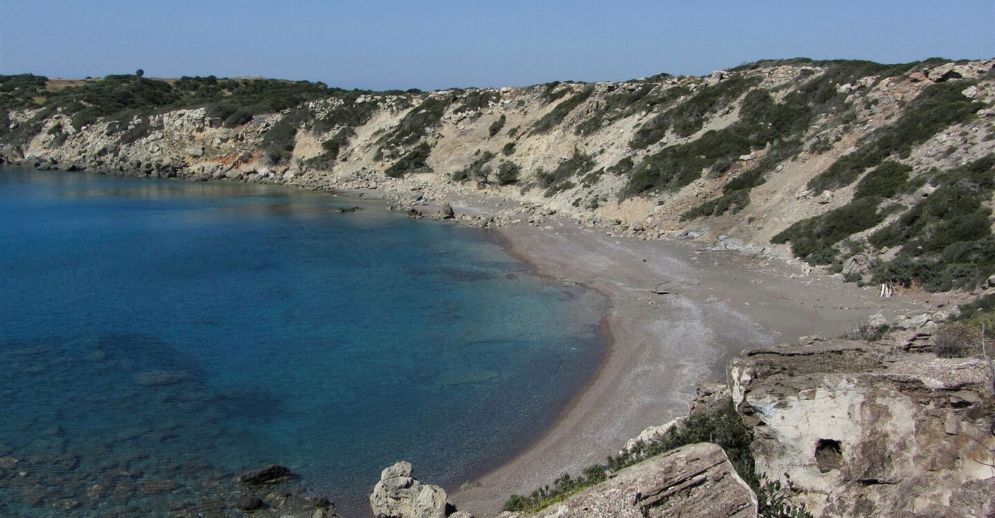 Hinter der scharfen Landspitze mit einer auffälligen, vom Wind geformten Steinskulptur erreichen wir die (05) zweite Traumbucht (3 m). Sie ist etwas felsiger und teilweise hat sich Müll angesammelt. Vorgelagerte Felsen erschweren den Gang ins Wasser. Wir gehen bis zum Ende der Bucht und steigen in einer Erosionsrinne auf die 30 m hohe Klippe. Dort orientieren wir uns zu den halb links liegenden Ruinen und auf der beginnenden Schotterpiste herunter zur Taverne.