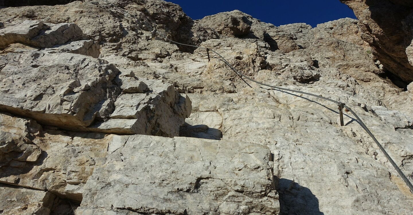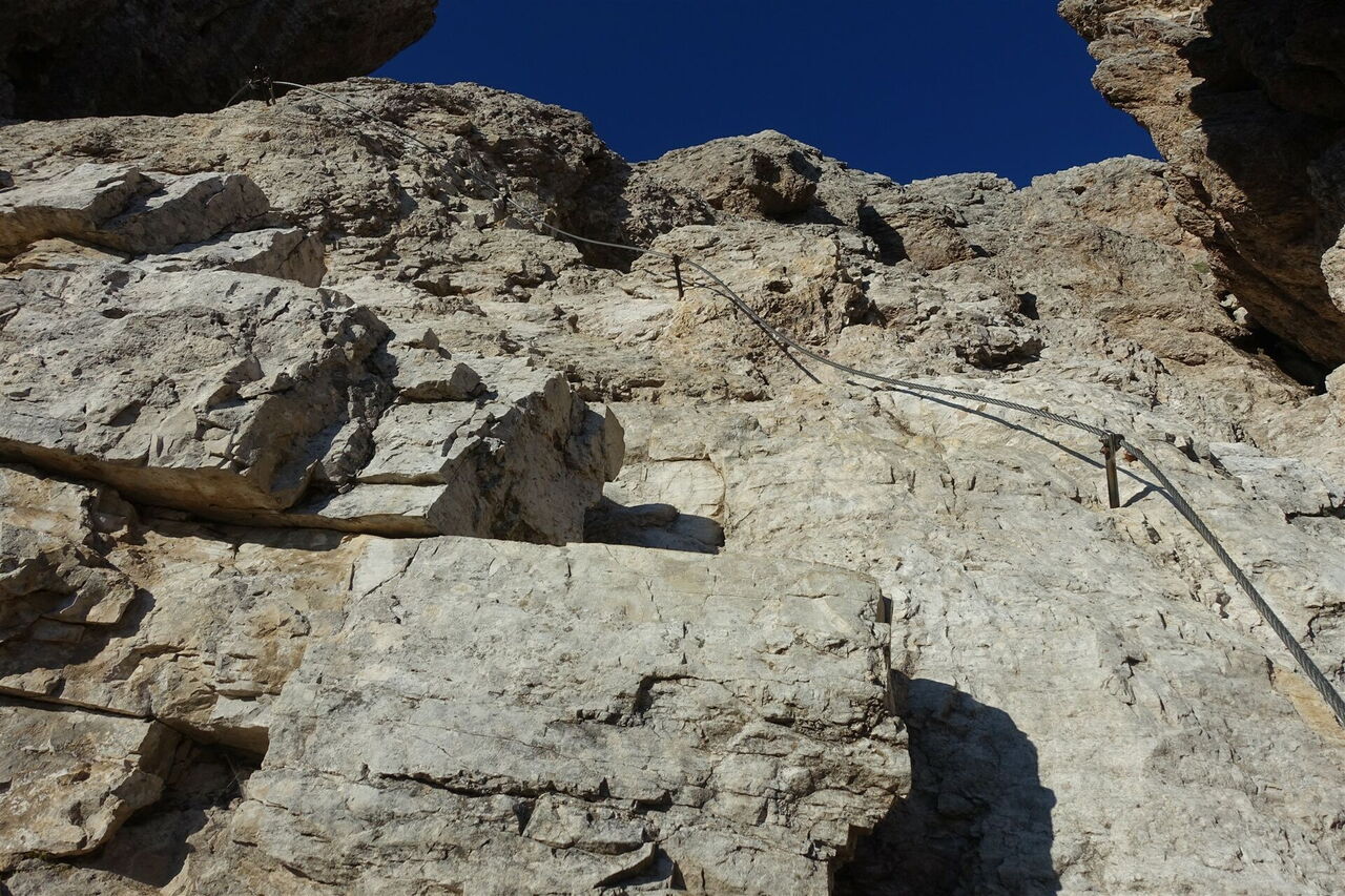 Schlussendlich steigt der Pfad an und endet vor einer Felswand, der 03 Anfang des Via Ferrata Averau (2.483 m). Es folgt zugleich die schwierigste Kletterstelle, ein dunkler Kamin.