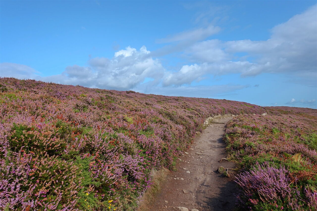 Vom Parkplatz gehen wir am Steinhaus vorbei und anschließend durch das grüne Gatter. Der Weg endet am Haupteingang des im 14. Jahrhundert erbauten 01 Fort La Latte (33 m). Die Festung thront auf einer Klippe oberhalb des Meeres, ist über Zugbrücken erreichbar und war somit nahezu uneinnehmbar. Wir gehen auf dem Zöllnerpfad in westliche Richtung entlang der Steilküste. Der Pfad definiert unseren Weg. Außer zwei Pfaden, die direkt zum Meer herunterführen, gibt es keinerlei Orientierungsprobleme und man kann sich an der Schönheit der Küstenlandschaft mit ihren im August blühenden Heideflächen erfreuen.