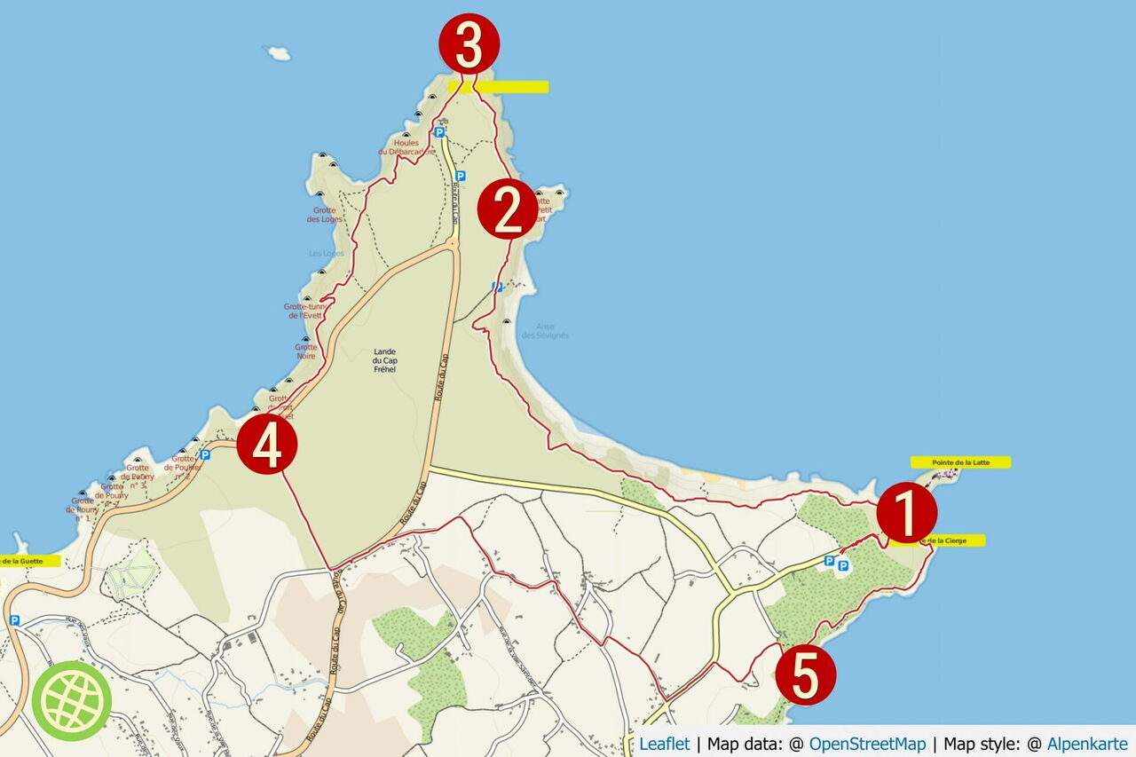 Busanbindung: Die Linie 2 der Busgesellschaft Tibus fährt von Saint-Cast oder Saint-Brieuc bis zur Kirche Eglise (Plévenon). Von dort sind es zu Fuß ca. 15 Minuten, um zwischen den Wegpunkten 04 und 05 in die Wanderung einzusteigen. Die aktuellen Fahrzeiten findet man auf der Webseite: http://www.breizhgo.com/en/. Pkw-Anfahrt: Die Wanderung befindet sich im Département Côtes-d'Armor, 48 km nordöstlich von Saint-Brieuc. Von dort fährt man auf der N12 und der D786 Richtung Cap Fréhel und folgt auf dem letzten Stück den Wegweisern zu einem kostenlosen großen Parkplatz. Die geografischen Koordinaten in Dezimalgrad für den Start lauten 48.664783 -2.291850.