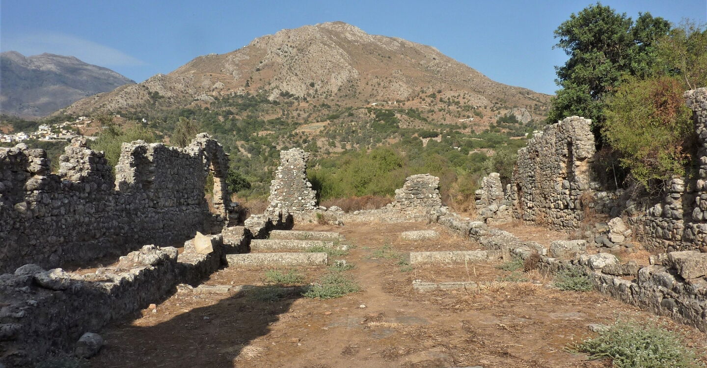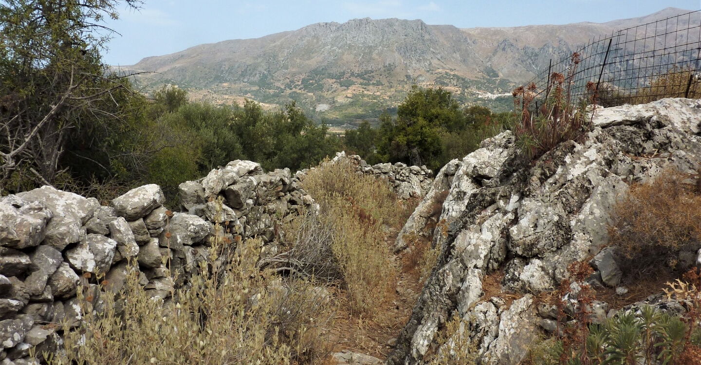 An der Weggabelung gehen wir halb links weiter, anschließend bei der nächsten Möglichkeit rechts, um nun parallel zum Wasserreservoir zu laufen. An dessen Ende bei der Weggabelung halten wir uns halb links. Nach 460 m überqueren wir eine Brücke nach links und erreichen das Dorf Lampiotes. Dort bleiben wir bei dem ersten Verkehrsspiegel auf der Hauptstraße und bei dem zweiten Verkehrsspiegel gehen wir geradeaus weiter. Nach 2,5 km erreichen wir einen Eichenwald, von links mündet eine Piste auf den Hauptweg – unser weiterer Weg, wenn wir nicht die Exkursion zum 02 palastartigen Komplex (352 m) machen. Nach weiteren 70 m gehen wir halb rechts auf dem mit einem roten Punkt markierten Pfad. Wir kommen an einer Quelle vorbei und gehen rechts durch das Dorf Monastiraki, um dann bei dem blau-grün gestrichenen Geländer rechts hinunter zu den Ruinen eines minoischen Palasts aus der Zeit von 1900 bis 1700 vor Christi zu gehen. Achtung! Die Anlage ist montags geschlossen.