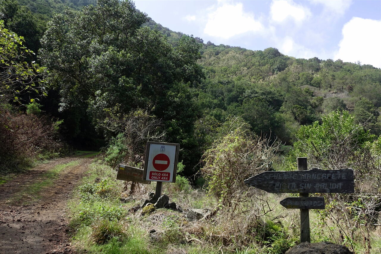 Busanbindung keine: Pkw-Anfahrt: Der Ausgangspunkt der Wanderung befindet sich 26 km von Valverde entfernt. Von dort fährt man auf der HI-1 Richtung San Andres, quert das zentrale Bergmassiv und fährt bergab Richtung Frontera. In einer Rechtskehre der Straße folgt man der Ausschilderung links Richtung Fuente Mencafete. Die Piste endet an einer Weggabelung, an der es links mit einem Vierradantrieb direkt zur Quelle geht. An dieser Stelle kann man nach 20 m bergauf bequem parken. Es führt auch noch eine Piste extrem steil bergauf von Sabinosa, aber von der Anfahrt aus dieser Richtung ist abzuraten. Geokoordinaten: 27.736367 -18.080483.
