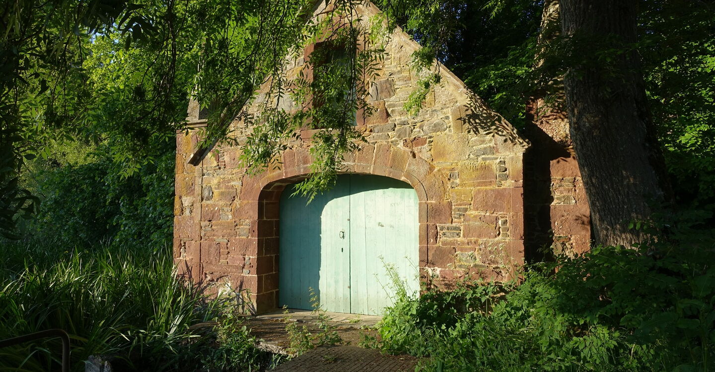Vom Platz vor der Turmuhr am Schloss gehen wir nicht halb links bergab, sondern bis an die Weggabelung vom Hinweg vor. Hier gehen wir aber nun halb links an den Rhododendren vorbei. Hinter zwei Torbögen befindet sich auf der linken Seite der Eingang zum 04 Castle Garden (57 m). Solche mit einer hohen Mauer umfassten Gärten oder Höfe um mittelalterliche Abteien, Schlösser und Herrenhäuser wurden als Kräutergarten, Gemüsegarten und Obstgarten genutzt. Die hohe Mauer diente dazu, sie vor Wild und kräftigen Winden zu schützen. Wir queren den kostenpflichtigen Parkplatz und folgen dort dem gelben Wegweiser "Lochside Walk".